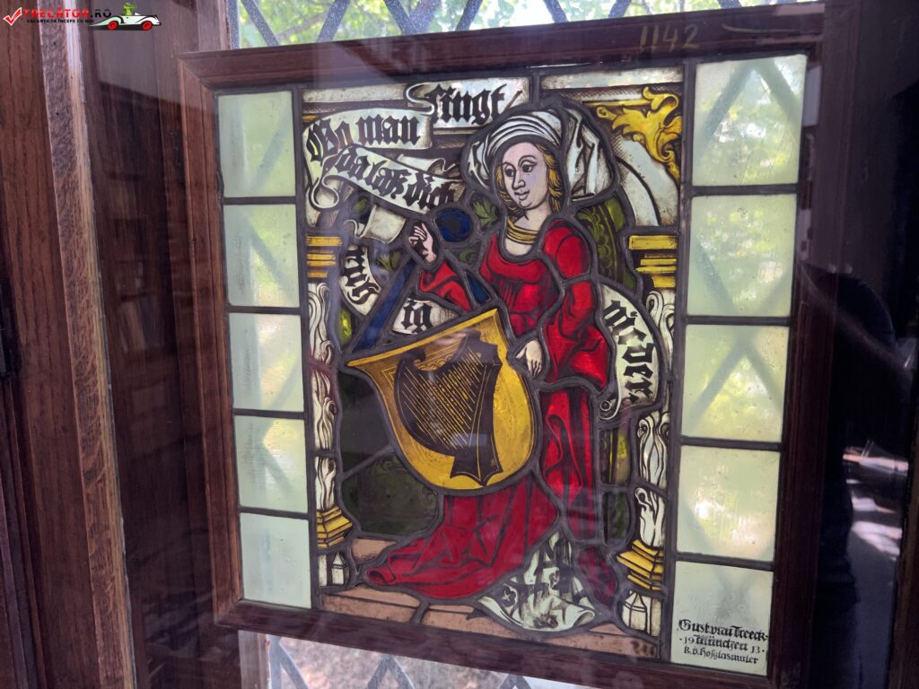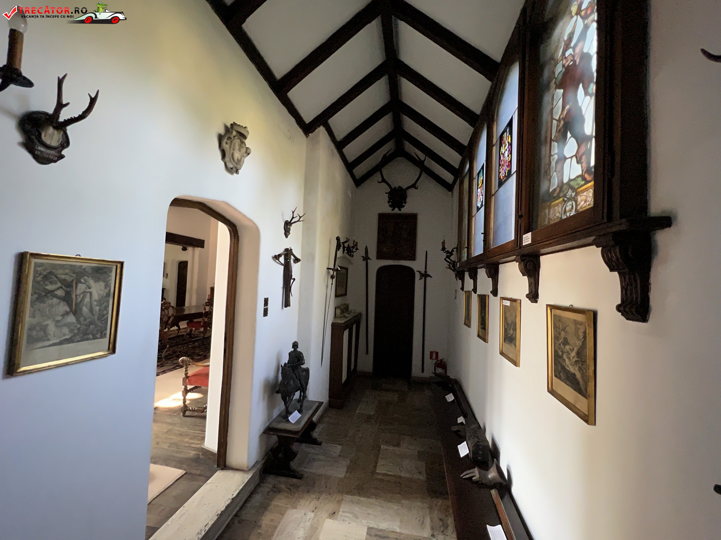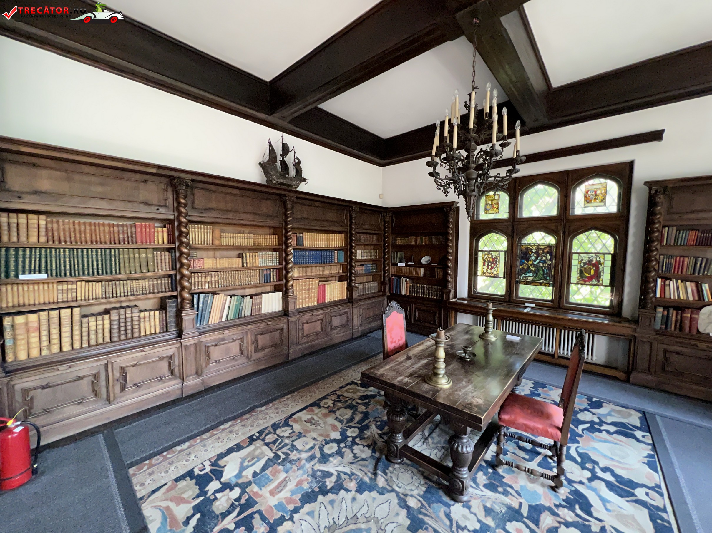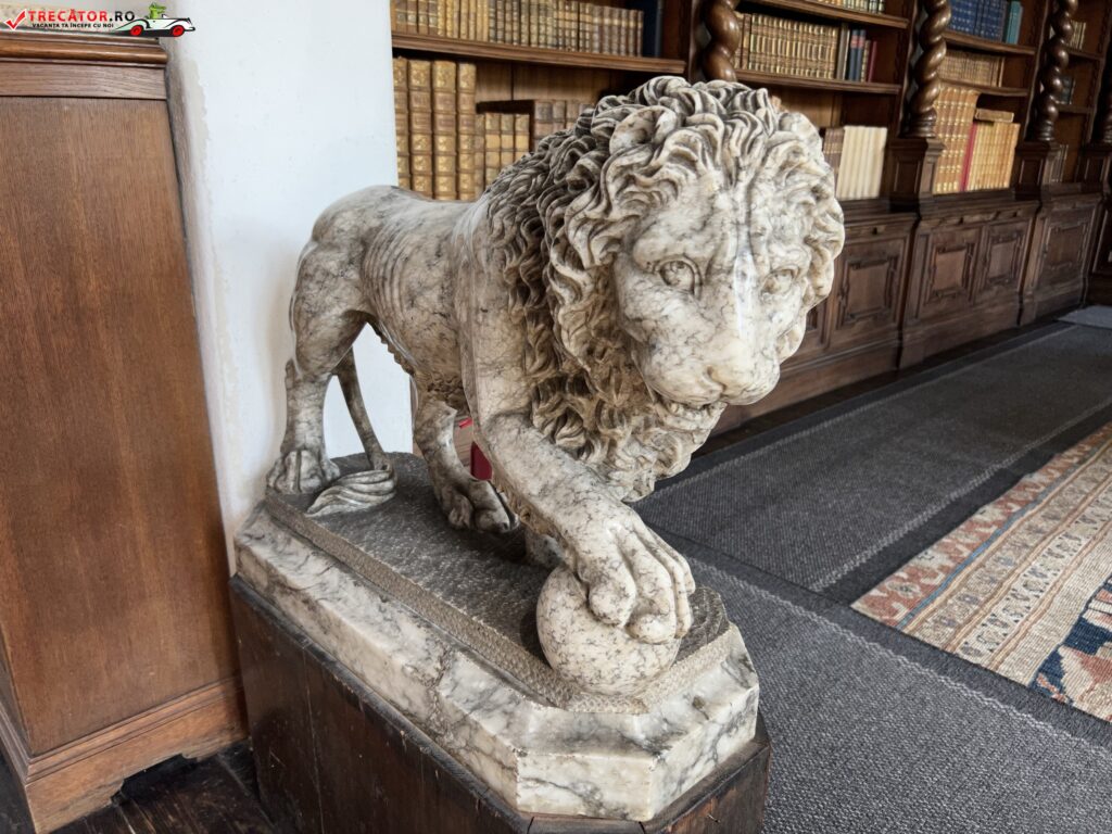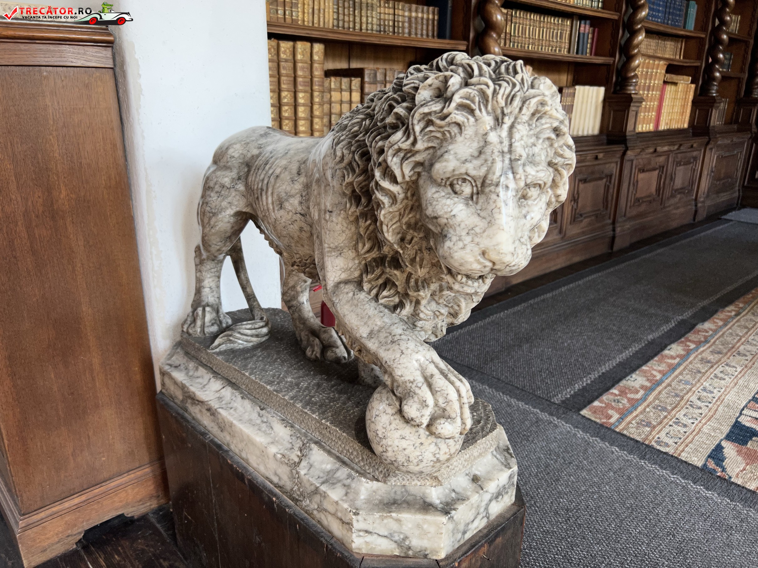 Doi lei impozanţi din marmură, replici după cei care se află în „Loggia dei Lanzzi” din Florenţa, delimitează holul de bibliotecă. Biblioteca familiei deţine aproximativ 2.000 de volume şi a fost şi este decor pentru diverse emisiuni culturale de televiziune. Vitraliile sunt realizate în 1497 şi provin dintr-o catedrală din Tirolul de Nord, sudul Austriei.