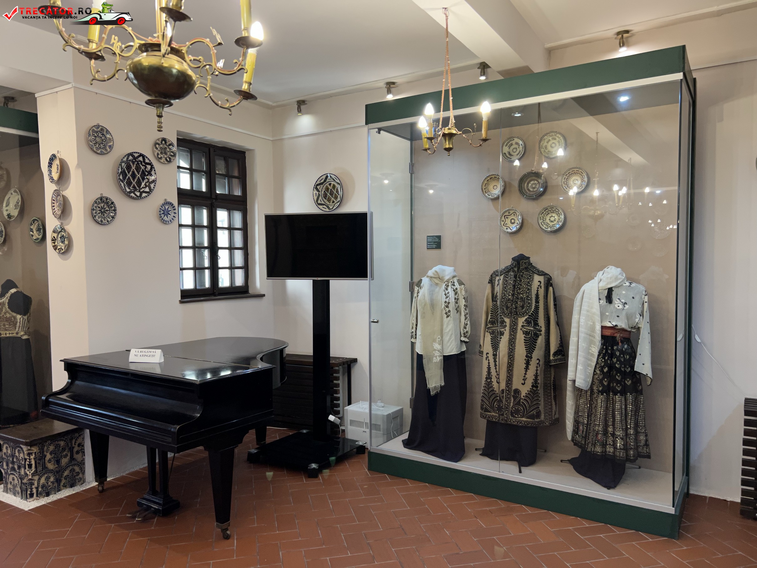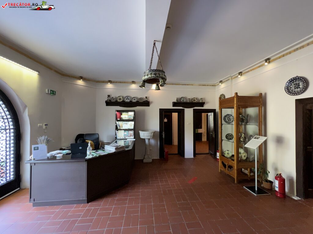 Dacă exteriorul se comportă neunitar, interiorul se pierde în decorații și combinații de simboluri într-un spațiu expozițional de mici dimeniuni. Însă rămâne remarcabil modul de decorație, care preia elemente folosite în mod uzual în casa tradițională, și aduce inserții inovative preluând motive ornamentale de ceramică sau textile, plasate pe pereți (friza cu motive oltenești și vasele de ceramică de pe tavan).