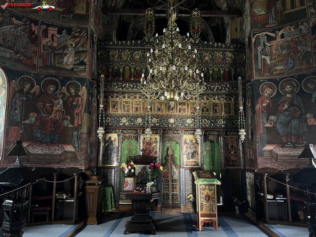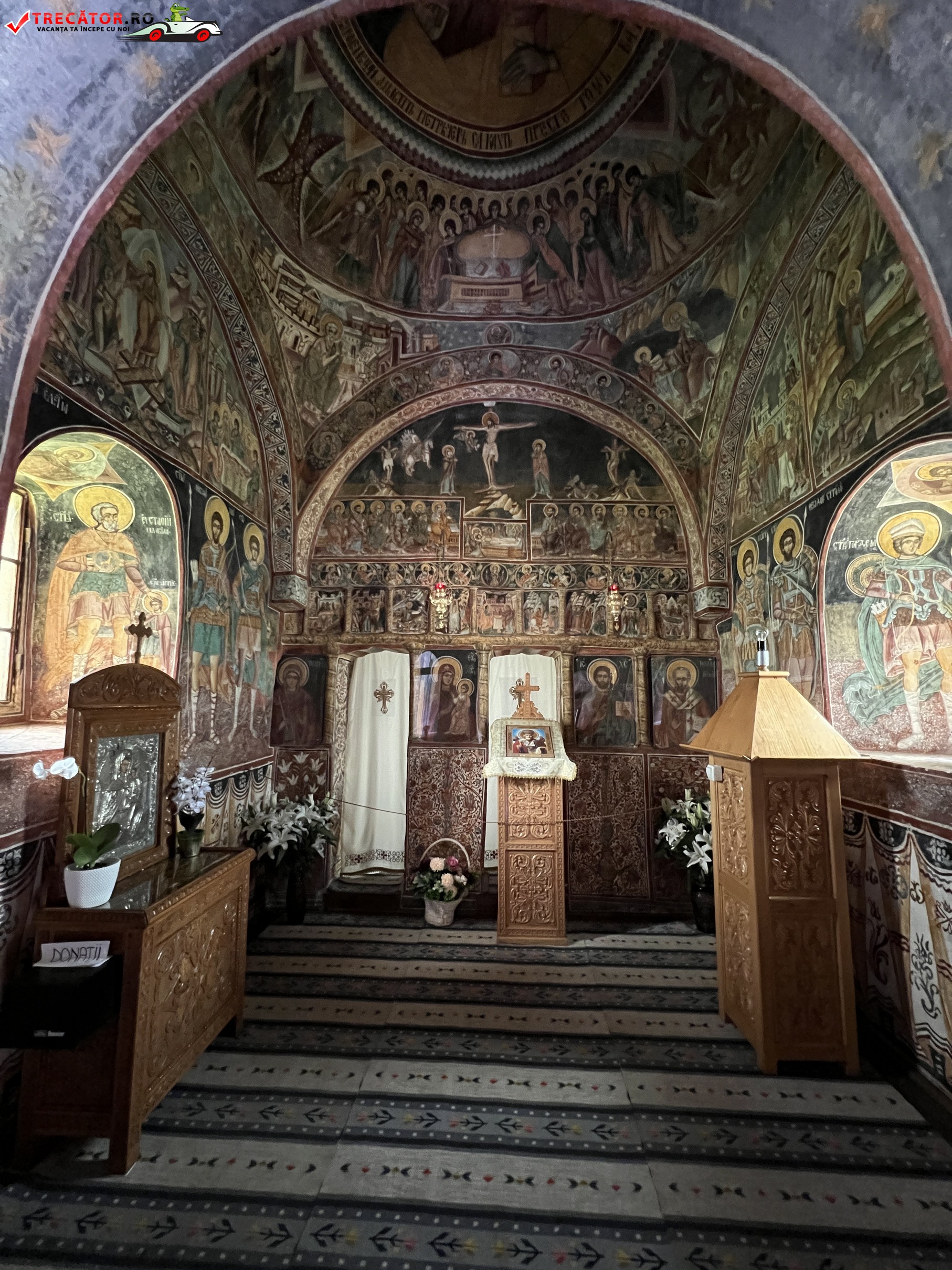 Catapeteasma executată din lemn de tei, reprezintă o adevărată capodoperă a vechii sculpturi românești, având o bogată ornamentație cu împletituri florale. Pridvorul în stil brâncovenesc este spațios, deschis, susținut de opt coloane din piatră. În pridvor este piatra funerara a surorii ctitorului.