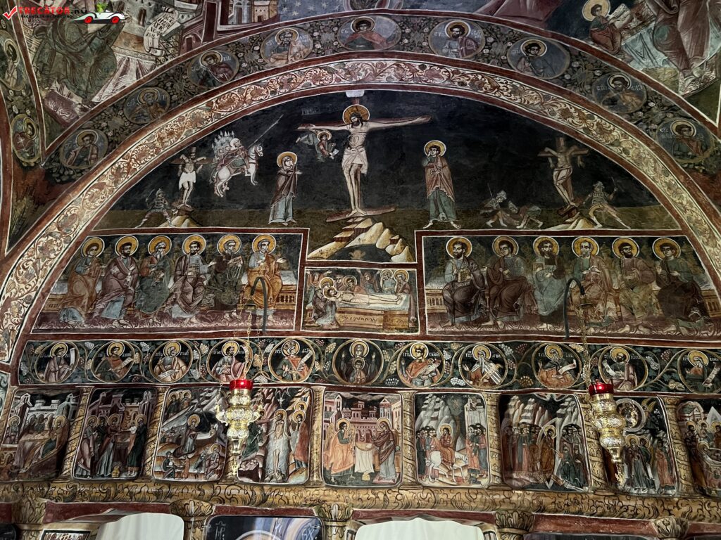 De o parte şi de alta a intrării în pridvor se pot admira cele două reprezentări, iconografice, unice în ţară noastră ale mănăstirilor româneşti închinate la Sfântul Munte Athos. Chiliile şi celelalte încăperi ale mănăstirii sunt orânduite în jurul bisericii pe laturile de est, sud şi vest, formând alături de zidul de incintă de pe latura de nord o adevarată cetate de apărare.