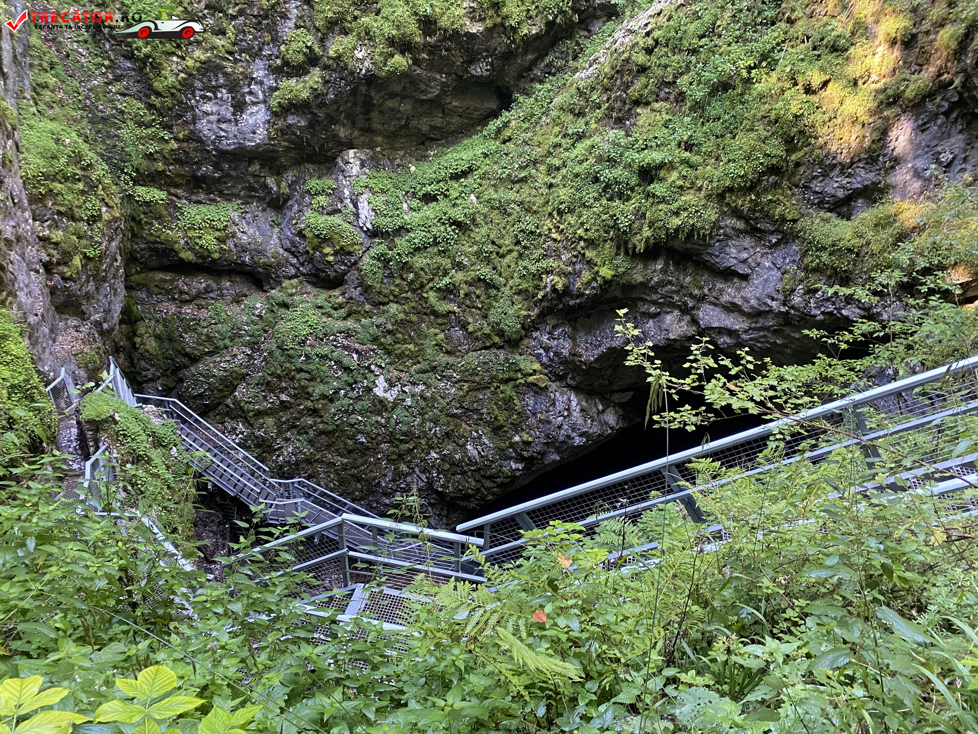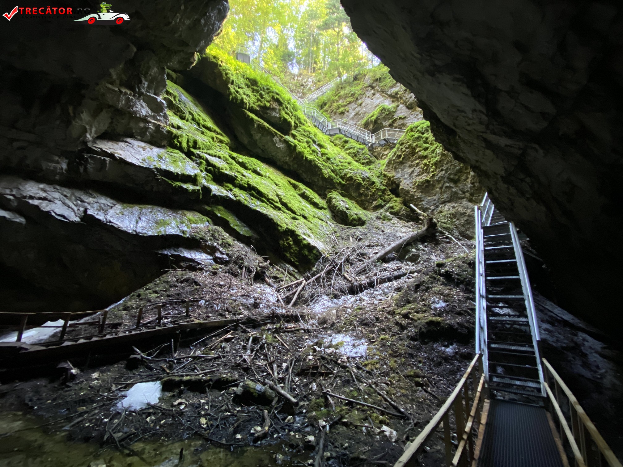 Dar meeeeerită! O mare gaură, mai largă sus, ce se îngustează pe măsură ce cobori pe o scară destul de îngustă (dar sigură), scară ce dă roată, lipită parcă prin minune, de pereții acestui horn! Aproape de intrare, scara de metal este înlocuită de o scară de lemn, ce coboară până la intrarea în peșteră. Un mic tur, pe niște podine din lemn, scoate în evidență frumusețea stalagmitelor (cele de jos), dar mai ales a stalactitelor (cele care atârnă din tavan) – scuze pentru explicație, dar poate nu toată lumea e familiarizată cu unii termeni – totuși – rar folosiți.