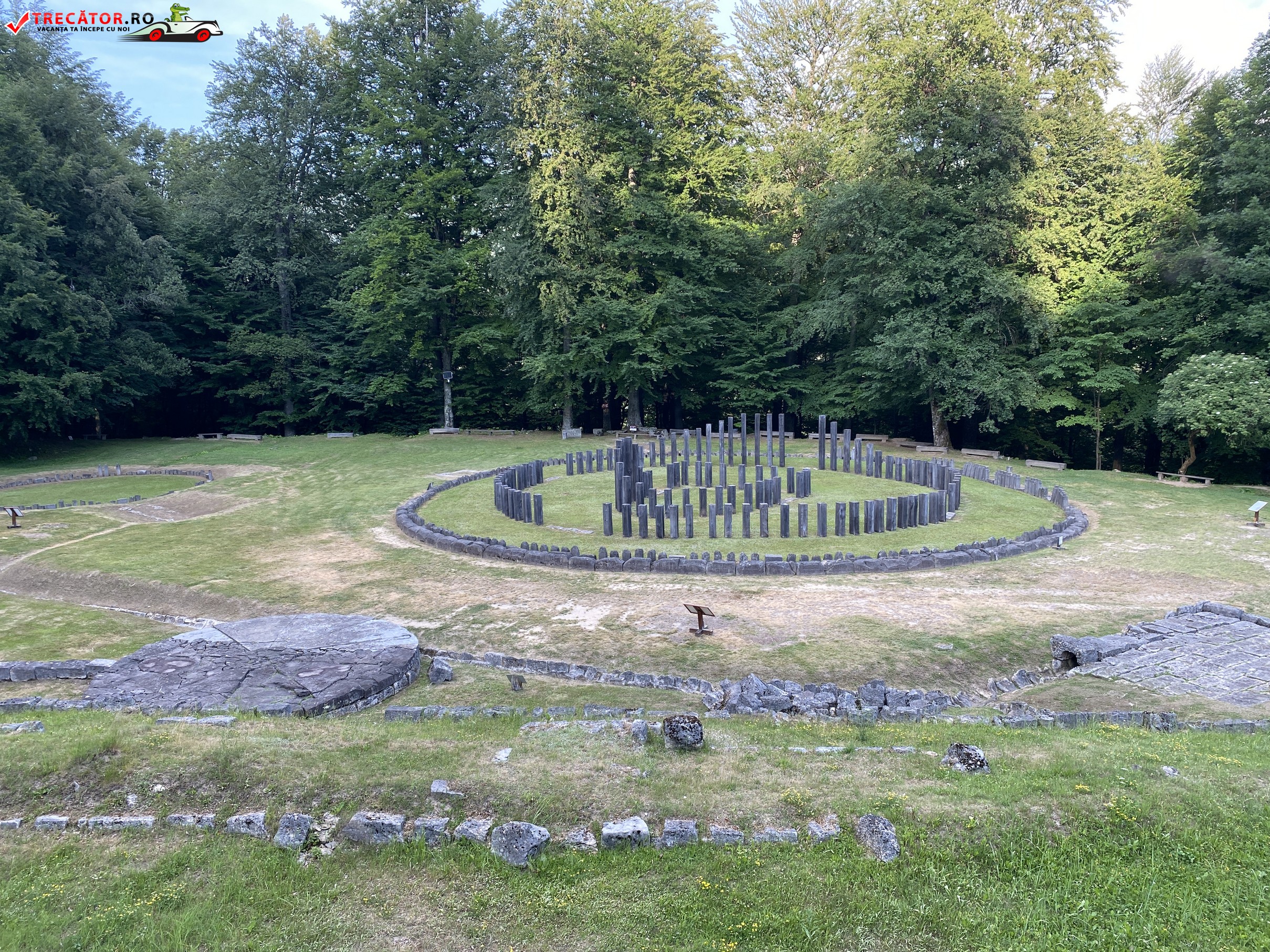 Un drum din lespezi de calcar cu o lungime de aproximativ 200 de metri făcea legătura între fortificație și zona sacră. Aici dacii au construit ziduri de calcar care ajung chiar și la o înălțime de 10 metri. Zona sacră include nu mai puțin de 7 temple: două sunt circulare, iar celelalte cinci au plan-patrulater. Tot aici exista un mare altar, dar și sisteme de captare și rețea de distribuire a apei.