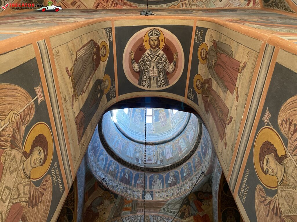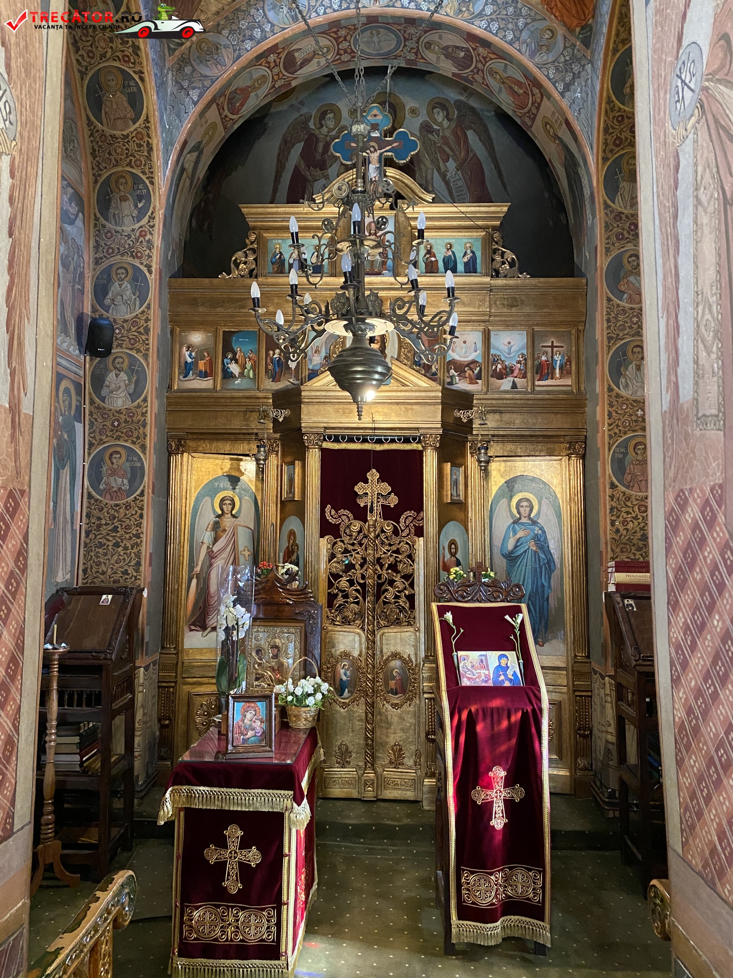 Interiorul este dominat de pictura în frescă, restaurată după modelele originale, redând scene biblice și chipuri de sfinți în tonuri calde, care îndeamnă la liniște și introspecție. Clopotnița și chiliile modeste completează atmosfera de retragere și reculegere spirituală.