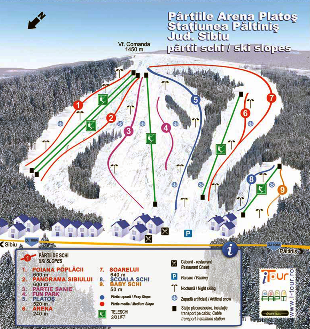 - 2: Pârtia Panorama Sibiului cu o lungime de 600 m, diferenţă de nivel de 100 m, capacitate de transport de 1200 persoane/oră.