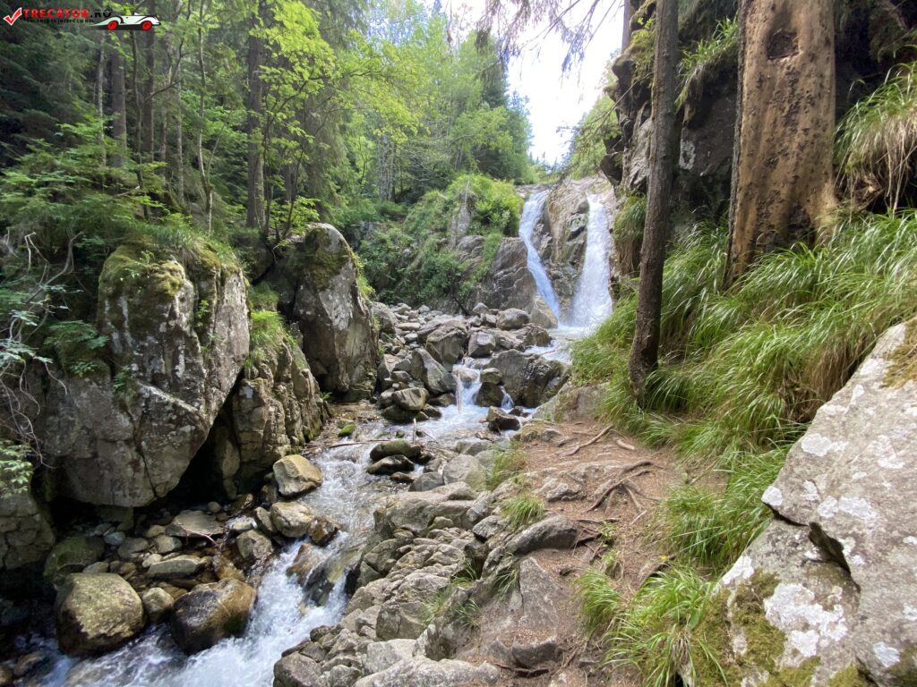 Cascada are o cădere de aproximativ 13–15 metri și se remarcă prin faptul că deasupra stâncii apa se desparte în două brațe ce se reunesc în vârful căderii — un element vizual impresionant pentru vizitatori. Cadru natural include vegetație montană specifică și formațiuni stâncoase de granit, ce se oglindesc în căldare, oferind un spectacol vizual unic.