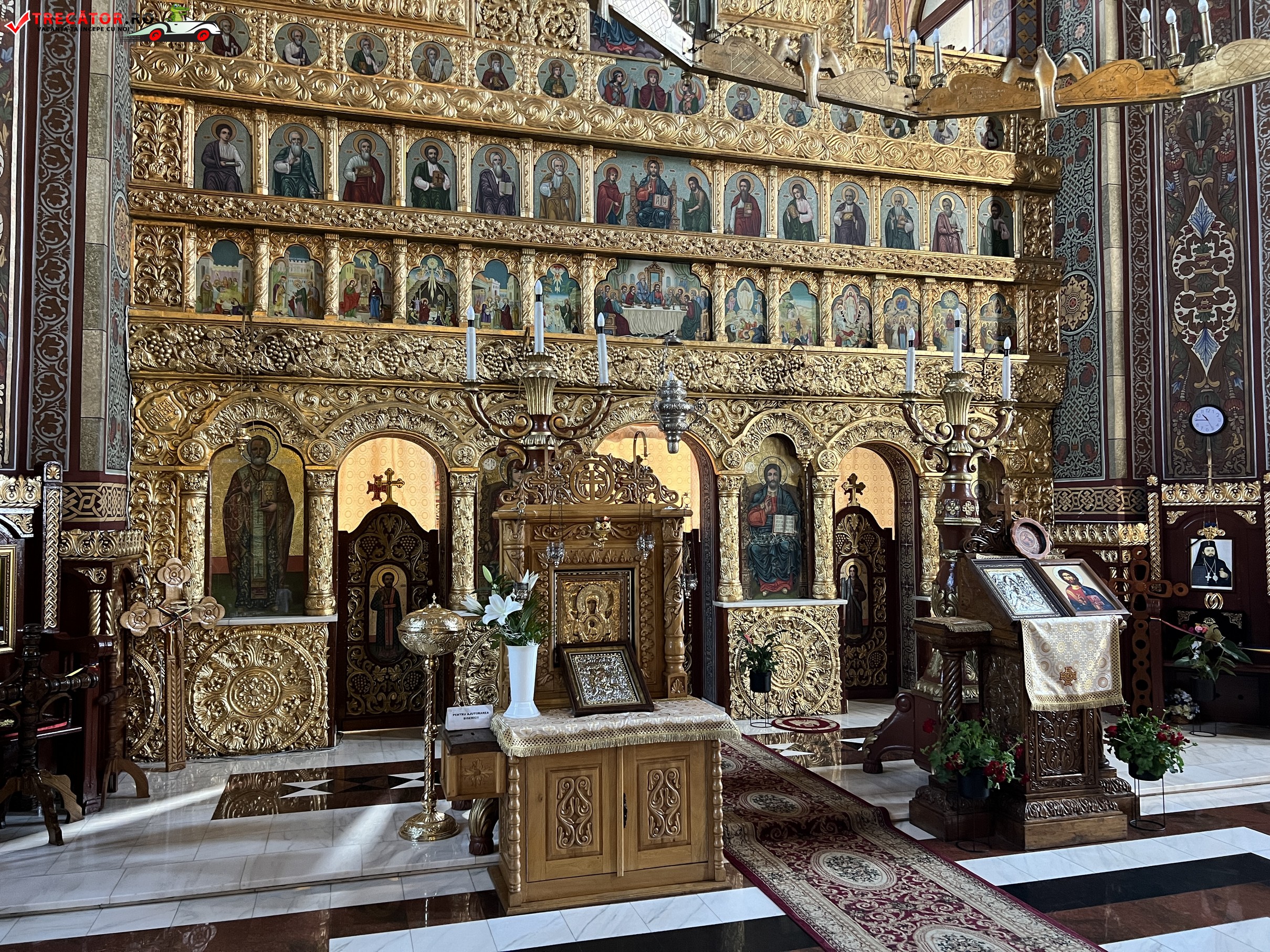 Curtea care o imprejmuieste este in ton cu biserica: larga, terasata, pavata cu marmura, marginita de pomi carora toamna le-a dat foc si de stalpi purtatori de felinare, impodobita cu vase monumentale din piatra si o fantana arteziana pe care este un basorelief cu Cina cea de taina.