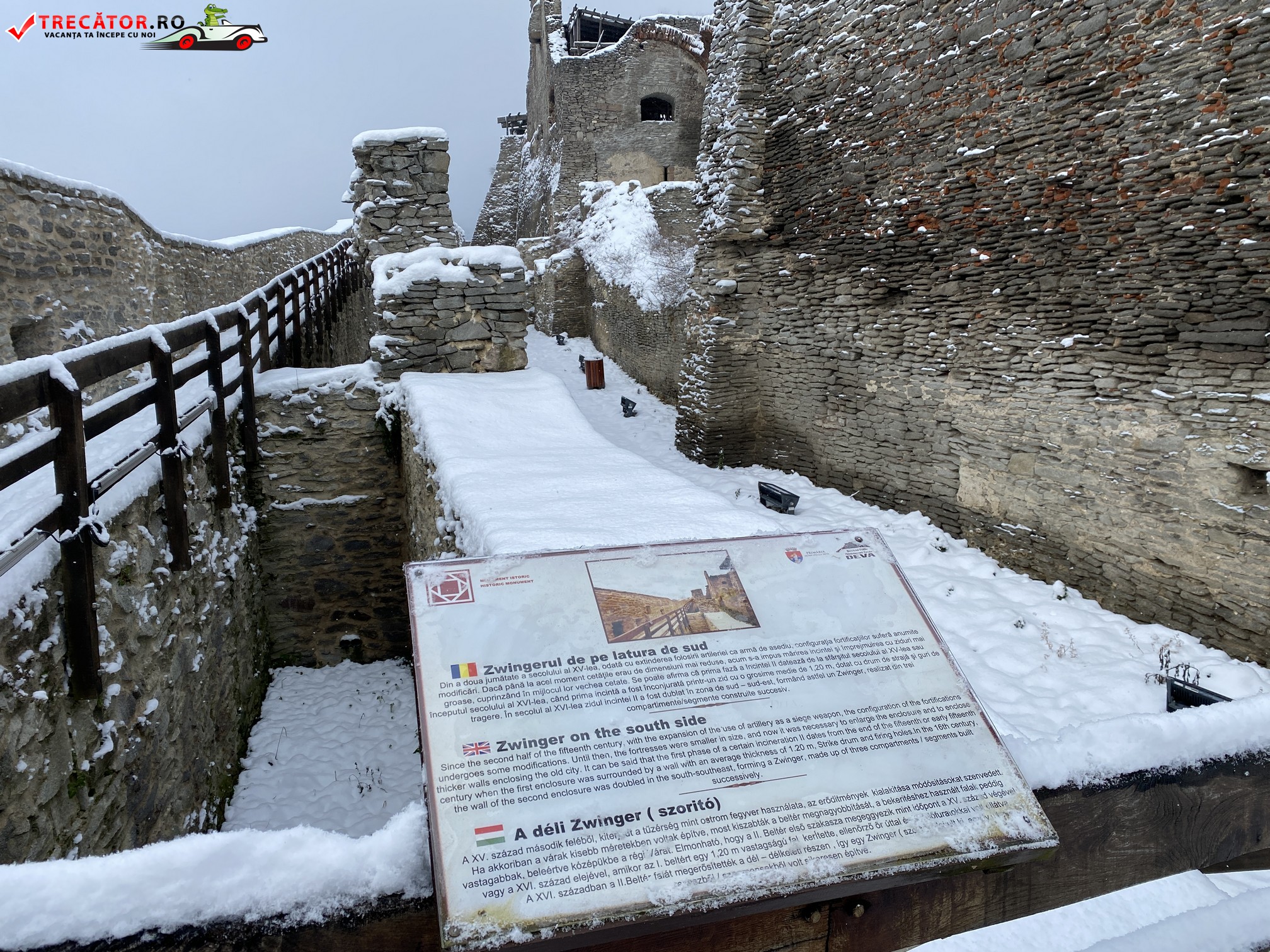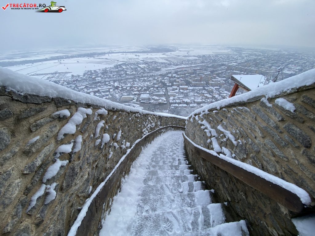 – cu mașina, până în mica parcare de lângă cetate, iar apoi, pe trepte, până sus, în fortăreața care veghează culoarul Mureșului, la granița dintre Transilvania și Banat.