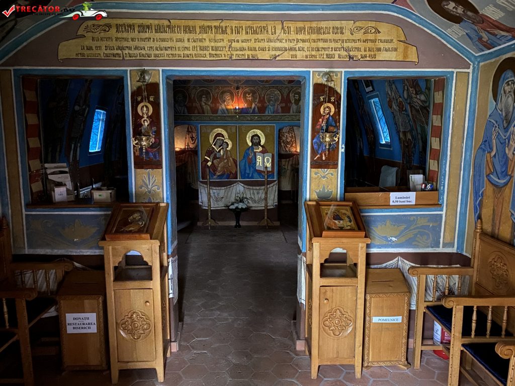 Biserica este împărţită la interior în trei compartimente: altar, naos şi pronaos. Luminatoarele (ferestrele) sunt de formă dreptunghiulară şi au un traiect ce se evazează dinspre exterior spre interior. Uşa de la intrare dispune de două fragmente de ancadrament din piatră de factură renascentistă refolosite pe post de lintel şi prag.