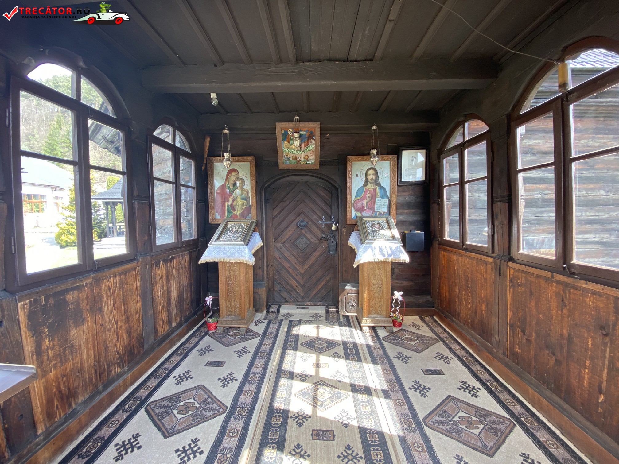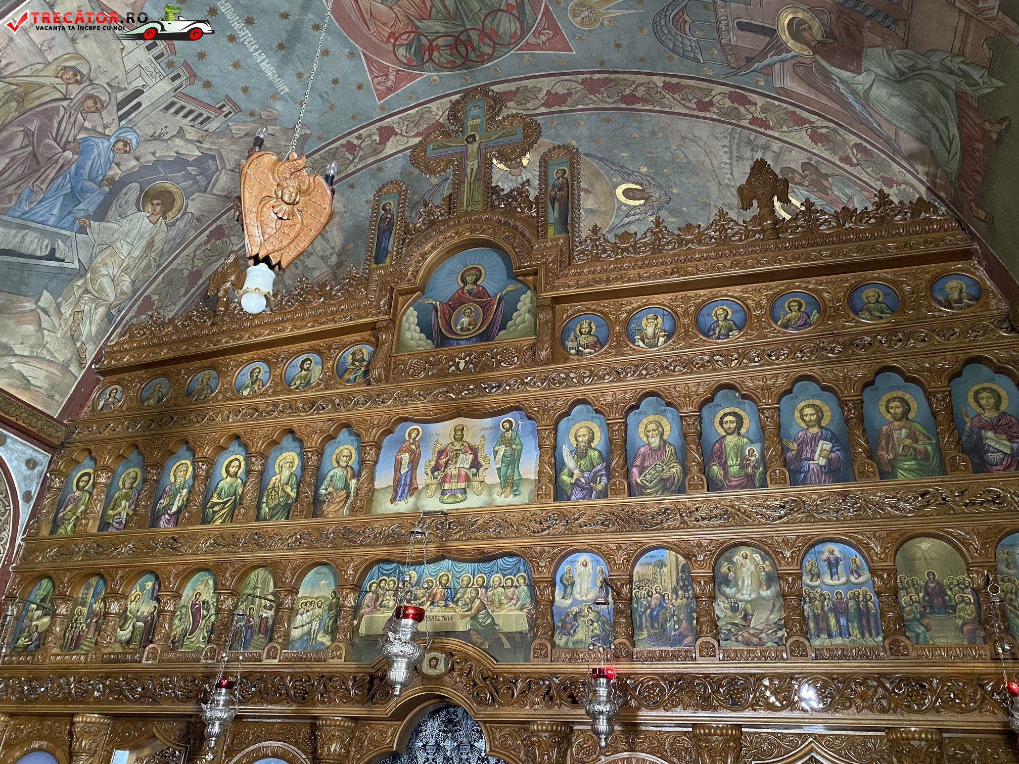 Iconostasul este din lemn de stejar sculptat de către o echipă de meșteri din Grumăzești, jud. Neamț. Ușa de intrare este dublă, sculptată pe ambele părțide către meșterul Ioan Moldovan din Idicelul de Pădure. În dreapta ușii este pictat Sfântul Cuvios Epifanie, iar în stânga Sfântul Cuvios Andrei. Deasupra ușii este scena „Acoperământul Maicii Domnului”.
