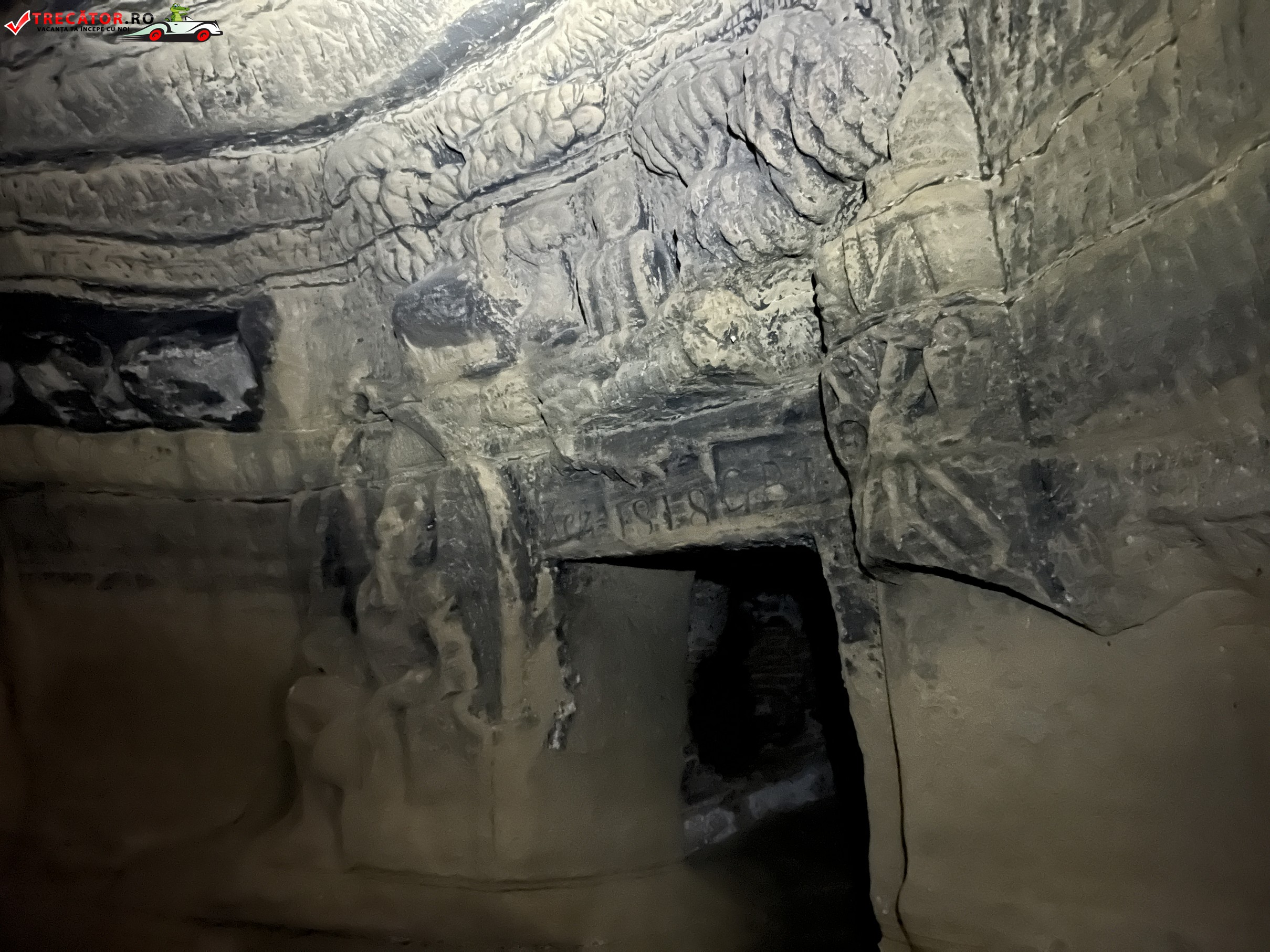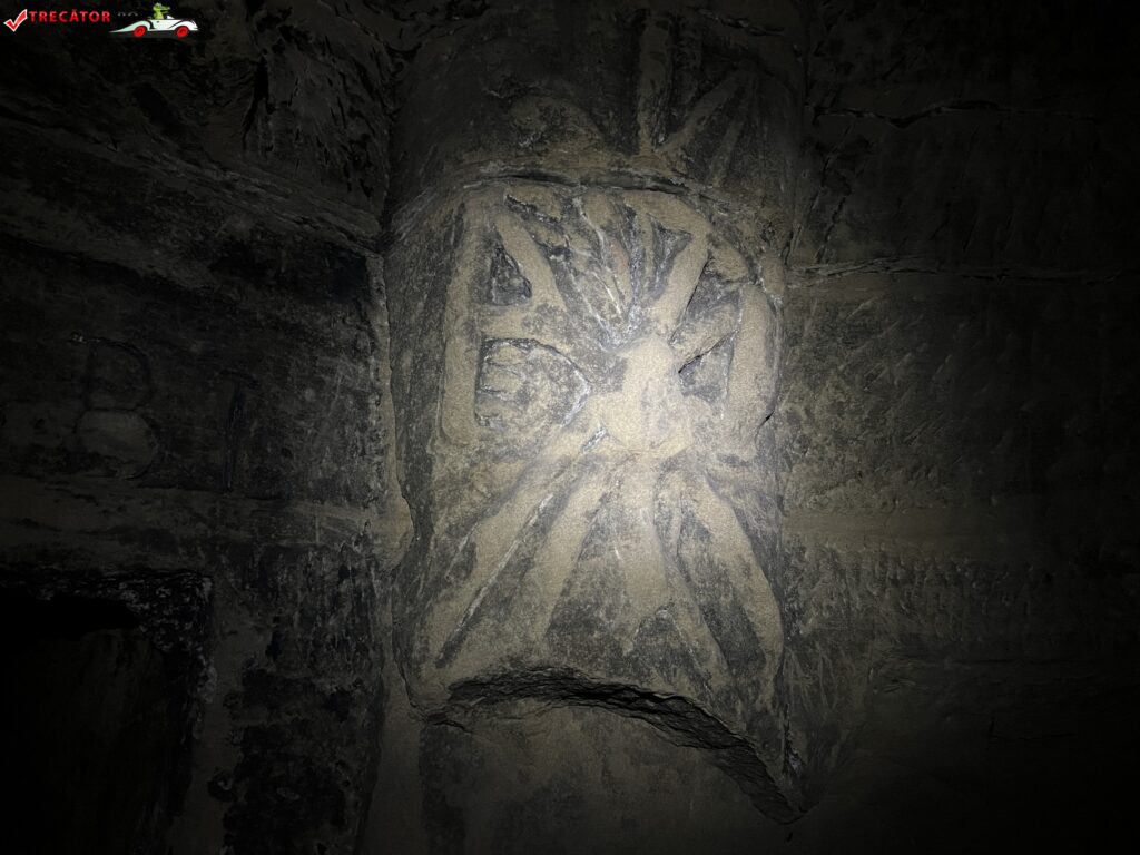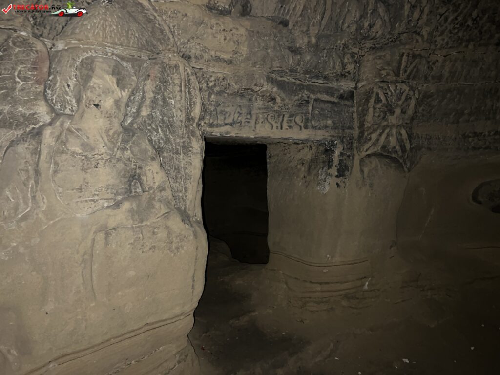 După spaţiul rotund al intrării în criptă, peştera continuă cu o ieşire aflată deasupra sa cu câţiva metri, scobită în peretele de stâncă. Pe partea superioară a nişei, care înconjoară ieşirea peşterii, sunt sculptate trei inscripţii a unor versuri despre fenomenul trecerii în nefiinţă.