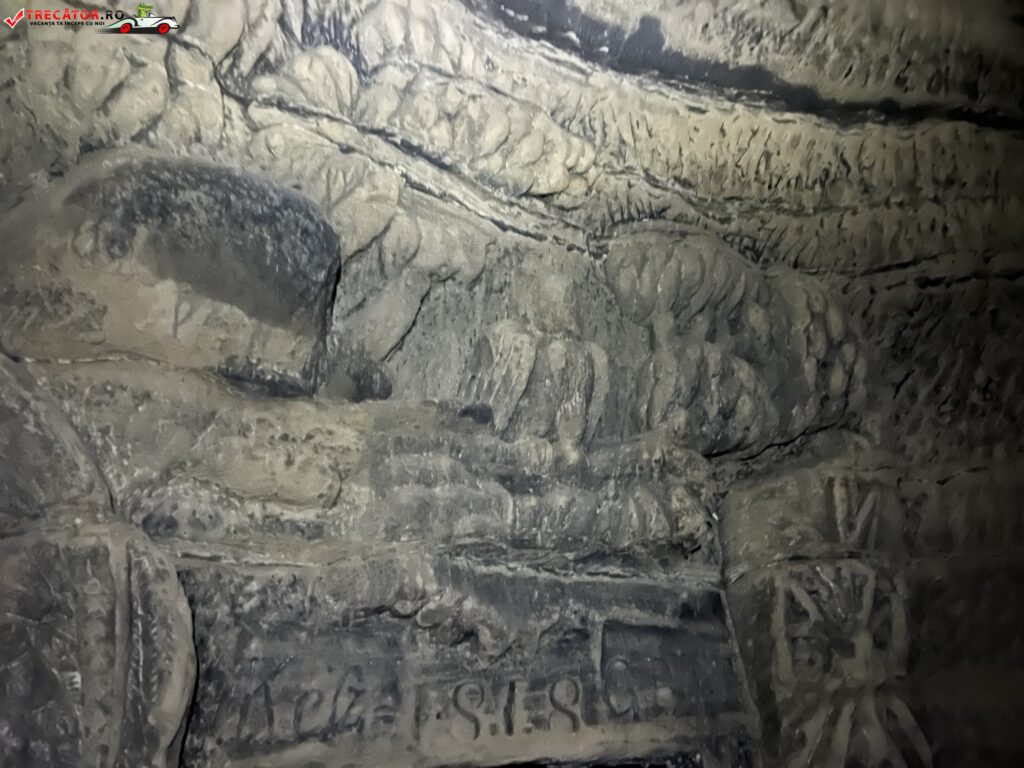 Pe partea stângă a intrării se vede figura şezută a morţii cu aripi, care în mâna stângă ţine o clepsidră, iar în mâna dreaptă o coasă uriaşă. Relieful deteriorat din dreapta intrării reprezintă câteva unelte: greblă, sapă, şi o ramură de palmier.