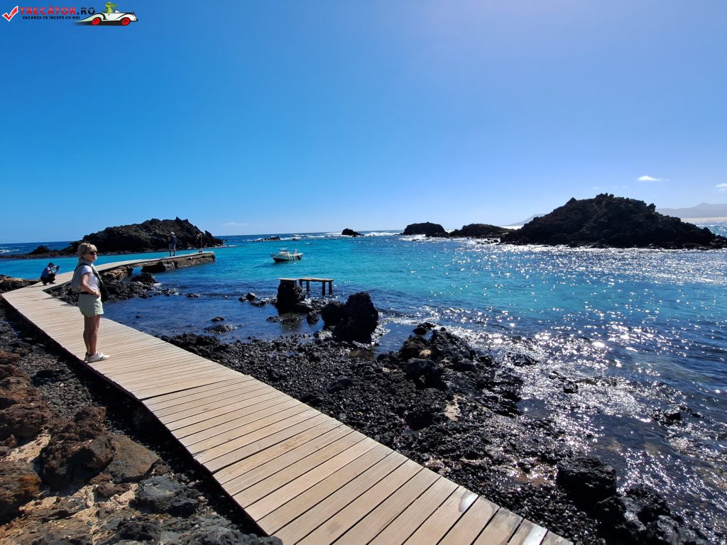 Experiența începe din Corralejo, stațiunea din nordul Fuerteventurii, de unde pleacă ambarcațiuni către Lobos. Traversarea este scurtă (de regulă, în jur de 15–20 de minute), dar suficientă cât să simți că „pleci din lume” și intri într-un spațiu protejat. Tocmai pentru că insula este arie naturală, accesul este reglementat printr-o autorizație (gratuită, personală), cu număr de vizitatori limitat pe intervale. Merită să tratezi asta ca pe o parte firească a planului: rezervi din timp autorizația, apoi alegi ferry-ul potrivit orei tale și te pregătești pentru o zi simplă, în aer liber.