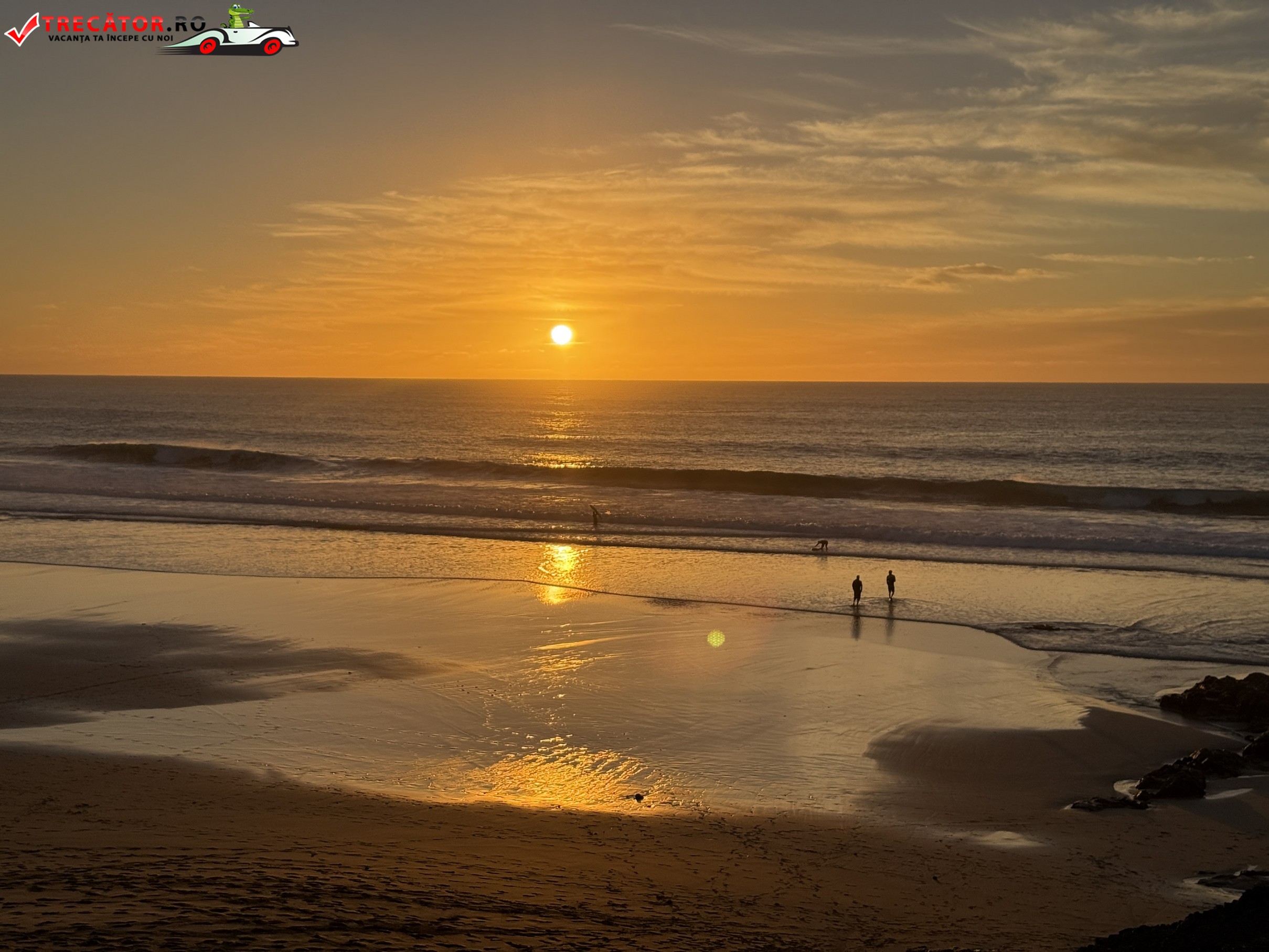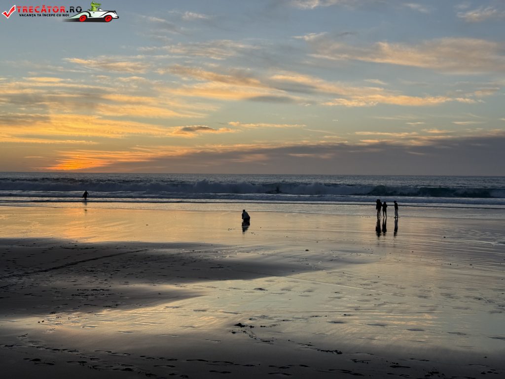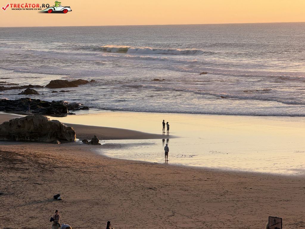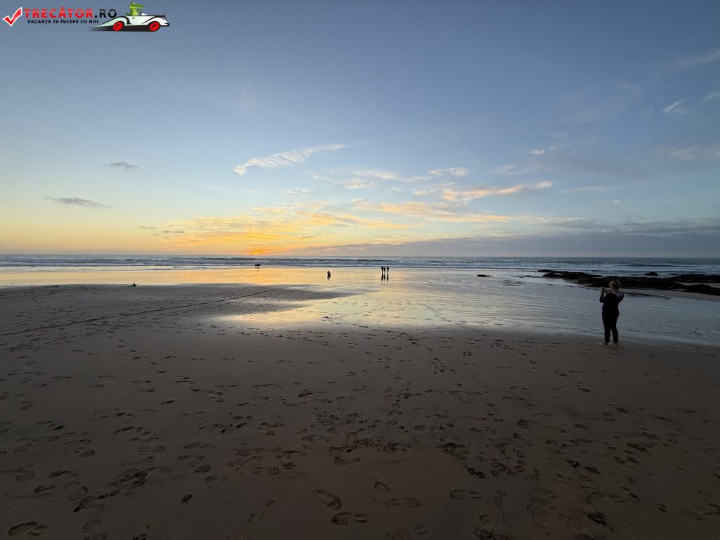 Peisajul e partea care cucerește rapid. De sus, de pe marginea falezei, vezi un golf larg care schimbă culorile în funcție de lumină, iar la apus zona devine un mic amfiteatru natural: stânci închise la culoare, valuri albe și un cer care „aprinde” apa. În zilele liniștite poți face plimbări lungi de-a lungul țărmului; în zilele cu swell, același traseu devine un spectacol de forță a Atlanticului, cu spumă și vânt care împinge sarea în aer.