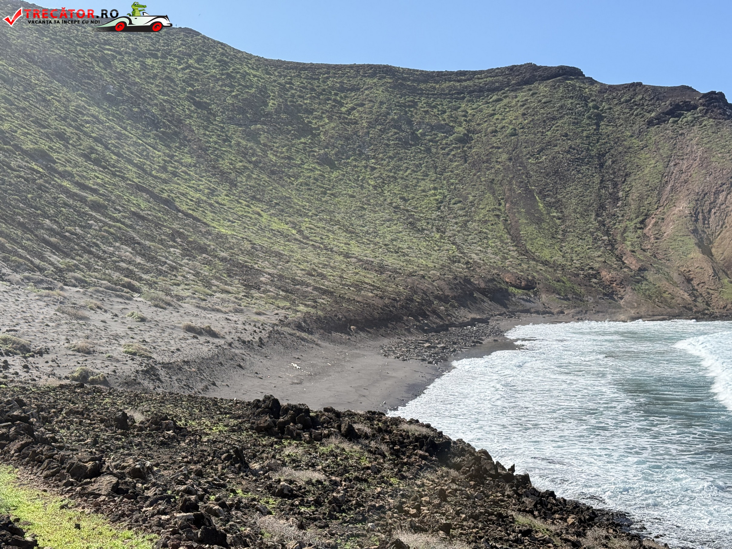 Ca aspect, vorbim de un litoral vulcanic: nisip mai grunjos și mai închis la culoare, roci negre, relief arid și un contrast puternic cu apa limpede, care poate căpăta nuanțe turcoaz în zilele senine. Unele descrieri menționează valuri moderate, deci nu e genul de golf adăpostit pe care să te bazezi pentru înot relaxat, chiar dacă ai avea voie să cobori pe plajă.
