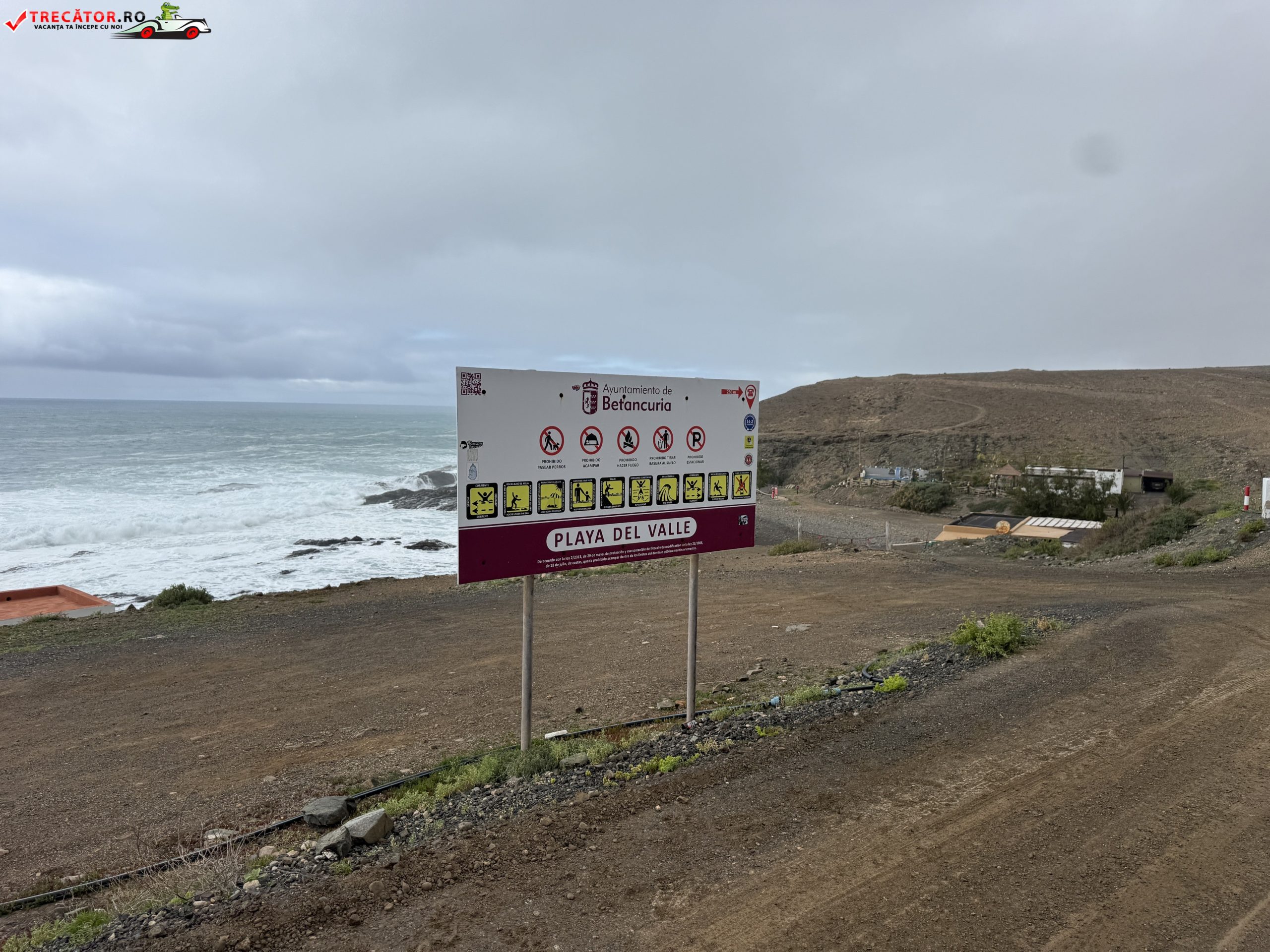 Pe coasta vestică a insulei Fuerteventura, în zona Aguas Verdes (municipiul Betancuria), Playa del Valle e genul de loc care nu seamănă cu imaginea clasică a Canarelor: mai puțin nisip fin, mai mult relief vulcanic, pietriș închis la culoare și un Atlantic care se aude înainte să se vadă. Plaja are aproximativ 200 m lungime și în jur de 50 m lățime, cu un amestec de nisip și pietre rotunjite.