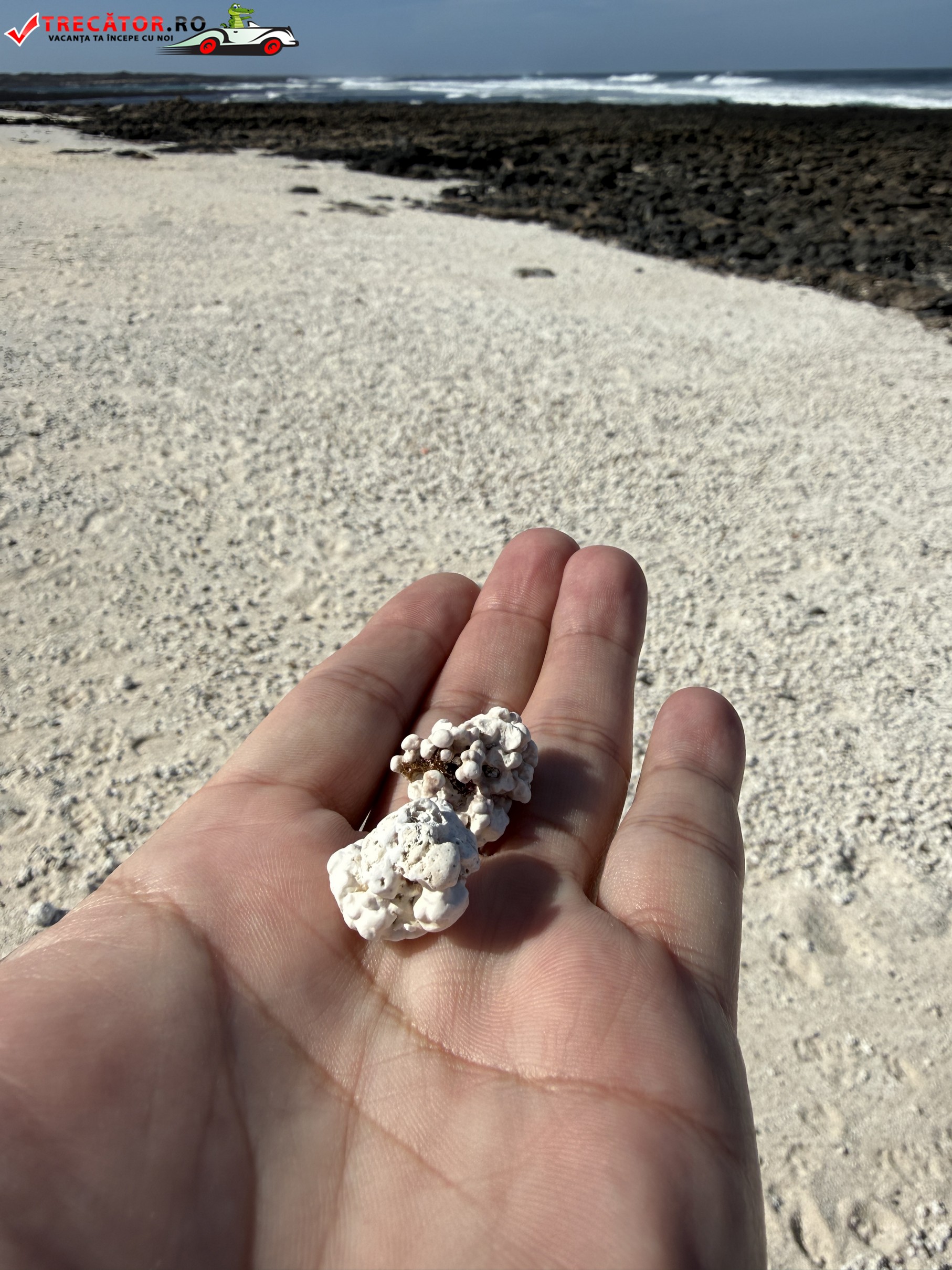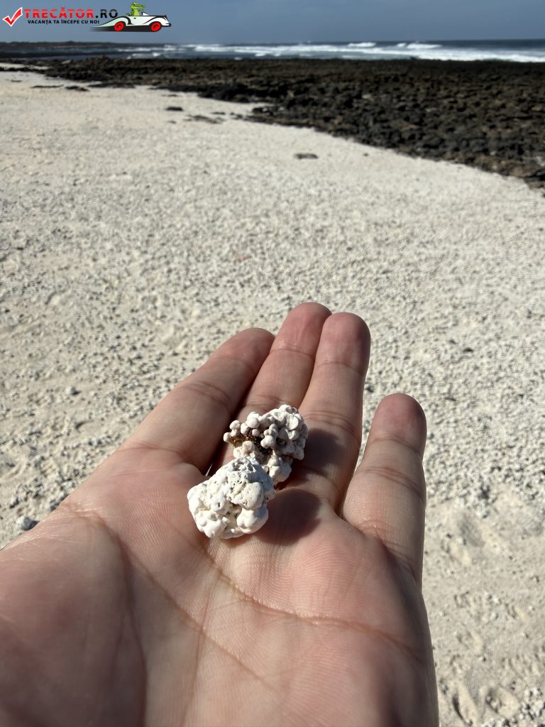 Unul dintre cele mai interesante aspecte ale plajei îl reprezintă micile pietre albe, rotunjite, care seamănă izbitor cu floricelele de porumb. Acestea sunt cunoscute popular drept „popcorn” și au devenit extrem de populare pe rețelele sociale. În realitate, ele sunt fragmente de coral fosilizat (în special alge calcaroase), care în timp au fost erodate și șlefuite de acțiunea apei și a nisipului, căpătând forma lor neregulată și textura poroasă. Culoarea lor albă contrastează puternic cu substratul vulcanic închis la culoare, creând un efect vizual unic.