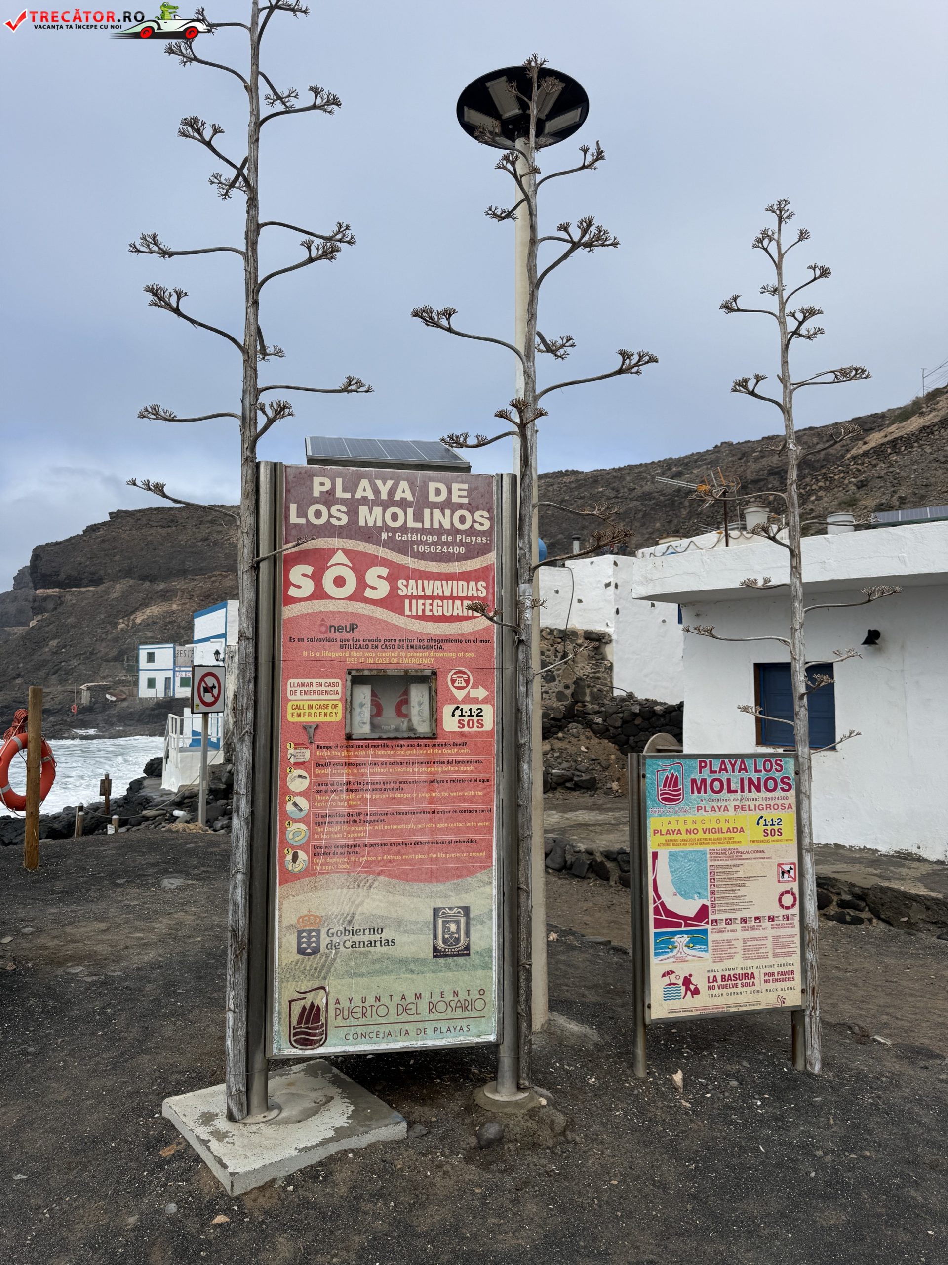 Ca să vezi tot tabloul, include în oprire și Mirador Puertito de los Molinos. E un punct de belvedere deasupra zonei, o plimbare scurtă (un “paseo”) până la un loc de unde se deschide panorama asupra golfului, plajei și falezelor. Priveliștea de sus te ajută să înțelegi geografia locului: cum se “închide” plaja între stânci, unde se adună valurile și, uneori, cum arată traseul posibil către peșteri atunci când marea se retrage. Este și un punct bun pentru apus, când relieful capătă contrast, iar culorile oceanului se schimbă rapid.