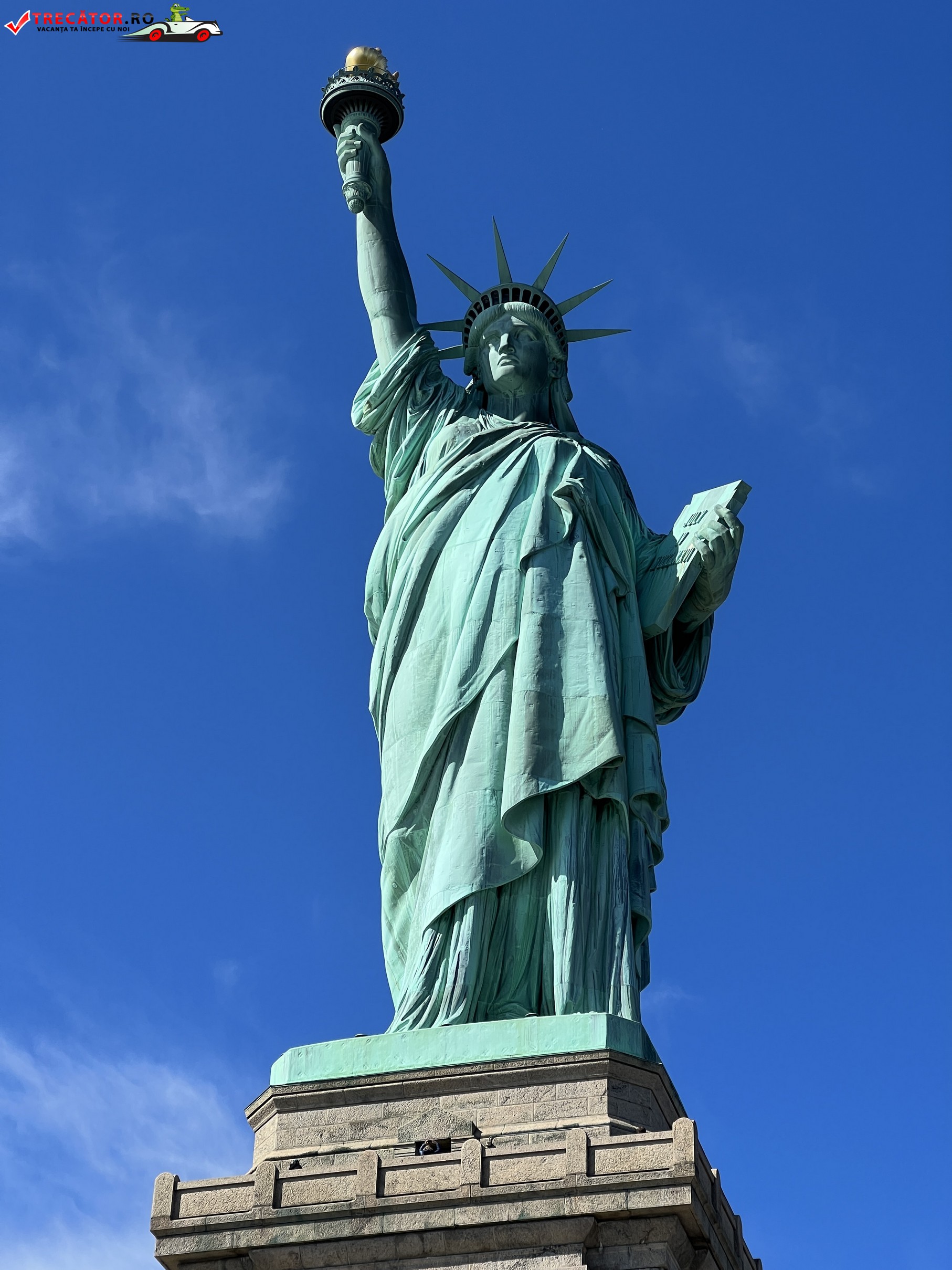 Statuia Libertății este o statuie imensă, înaltă de 93 de metri, realizată din cupru și placată cu aur, care reprezintă o femeie cu o coroană de șapte vârfuri și o torță în mână.