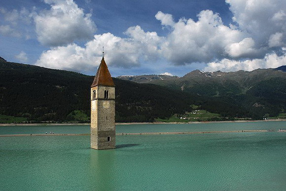 Lacul artificial din regiunea Reschen, Italia, a fost construit de compania Montecatini. Reprezentanţii companiei doreau să construiască un lac de acumulare însă au întâmpinat rezistenţă din partea locuitorilor. În cele din urmă, satele Graun şi Reschen au fost inundate în 1950. În acea vreme 163 de case au fost scufundate, la fel şi biserica, al cărei turn a rămas totuşi deasupra apei.