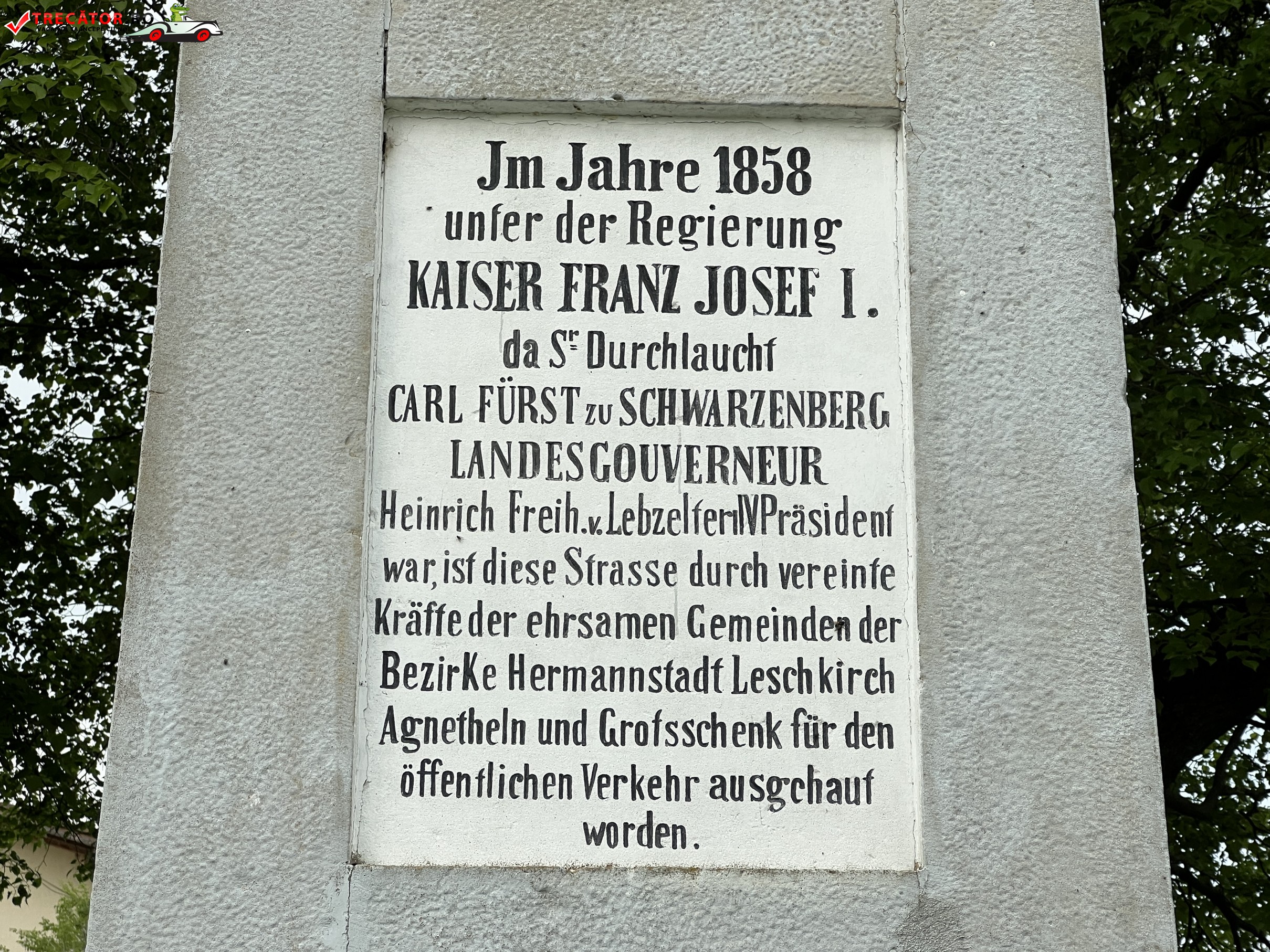 Explicatia e simpla: initial monumentul nu avea nicio legatura cu centrul tarii, ci pur si simplu marca constructia unei drum de catre inginerii Imperiului Habsburgic cu ajutorul muncii localnicilor si al contributiilor financiare ale notabililor locali. In 1858, nimeni nu avea cum sa calculeze ca acesta este centrul Romaniei deoarece nu avea cum sa stie care vor fi frontierele acesteia. Deci panoul cu inscriptia a fost adaugat mult mai tarziu, iar oamenii l-au asociat cu monumentul de alaturi, schimband semnificatia acestuia. Cat de tarziu a fost pusa inscriptia, insa?