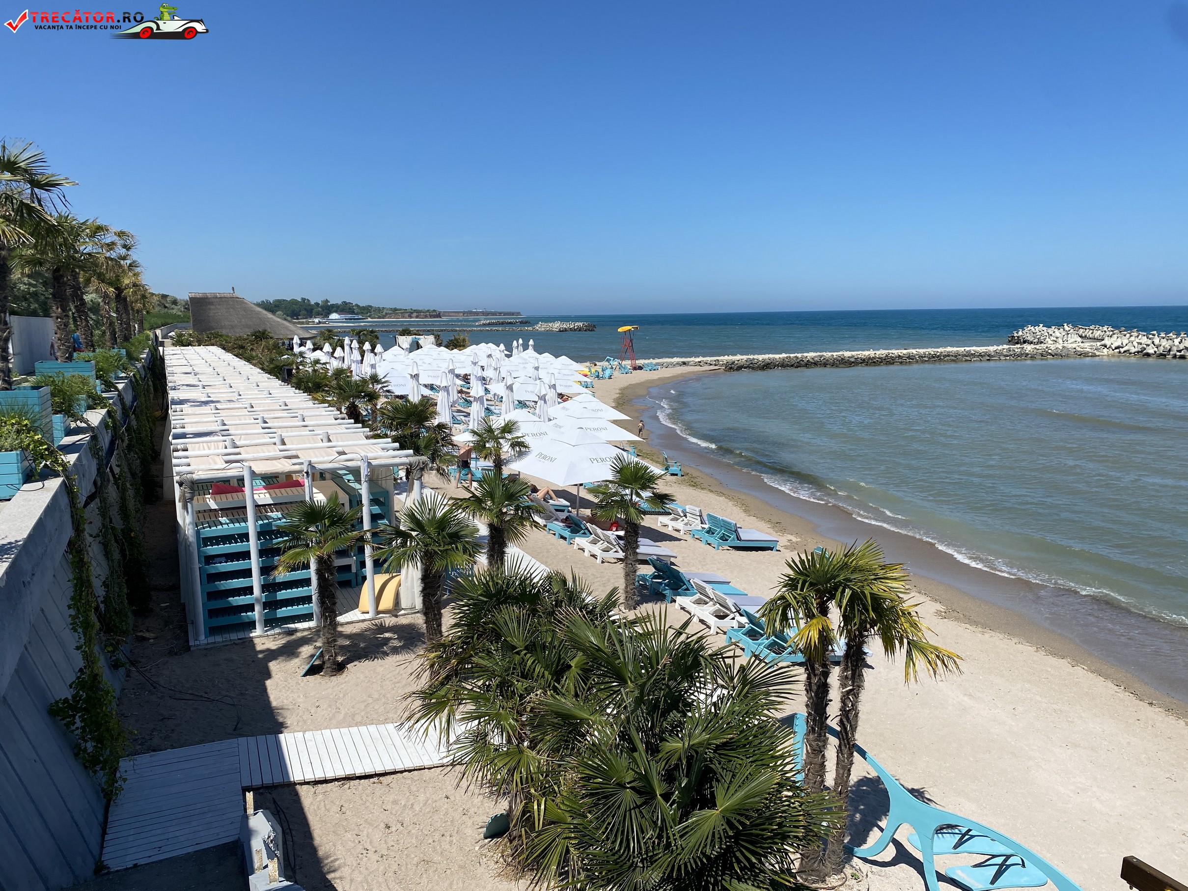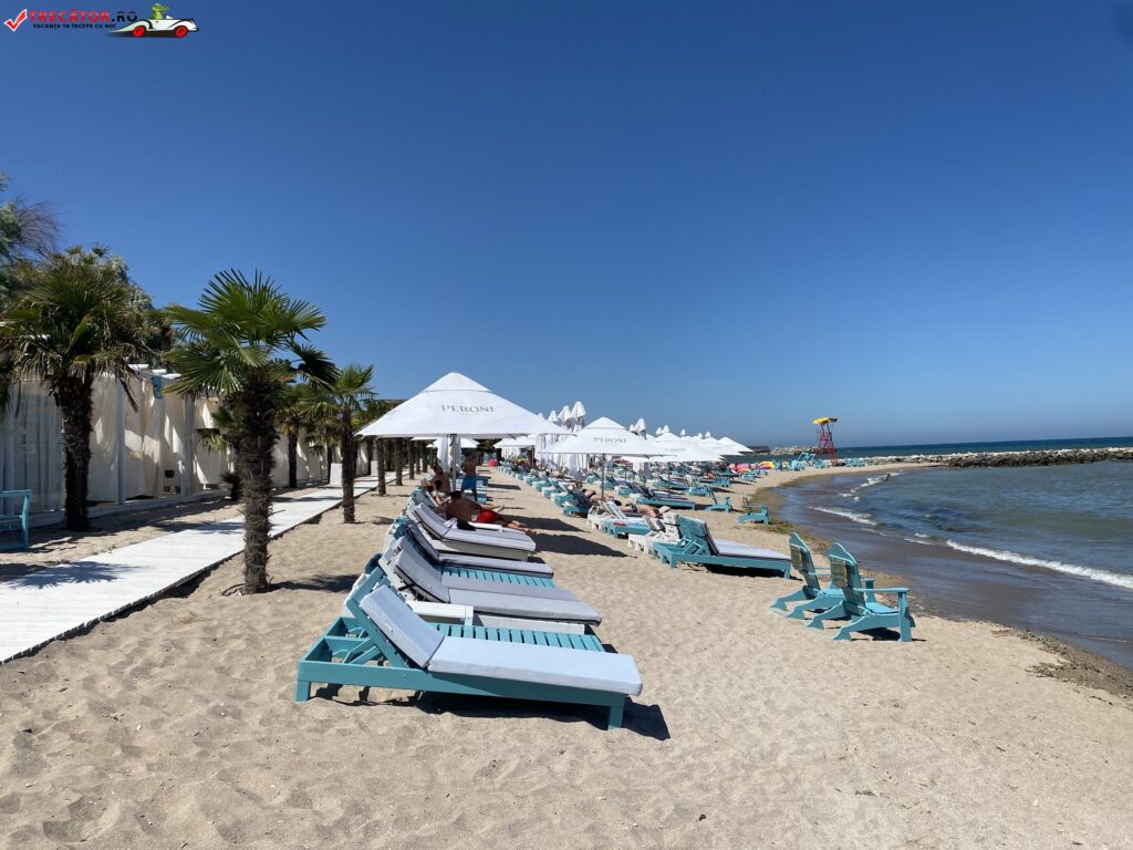 Anumite sectoare de plaja sunt amenajate cu sezlonguri si umbrele.
