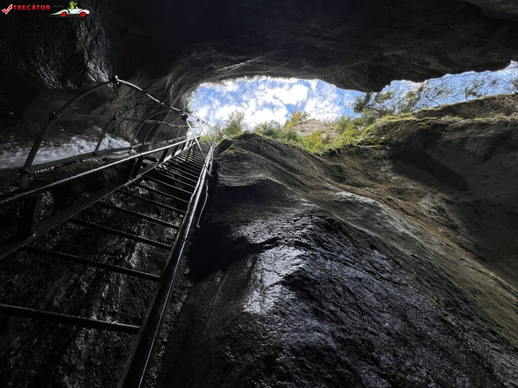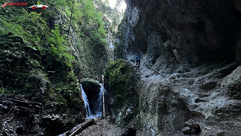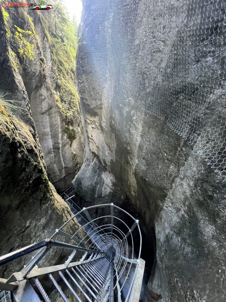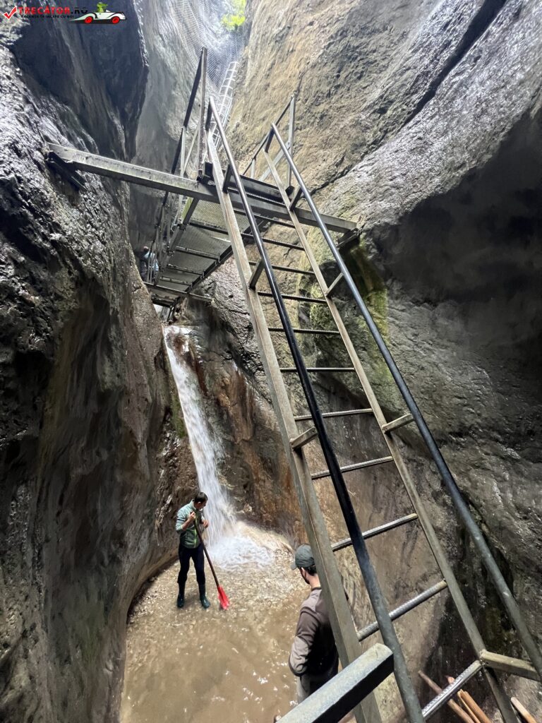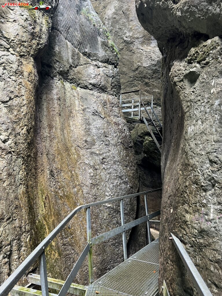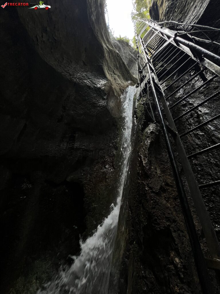 Pe măsură ce urci pe scări, apa curge pe lângă ele, creând o atmosferă spectaculoasă cu cascade și sunetul apei care răsună în canion.