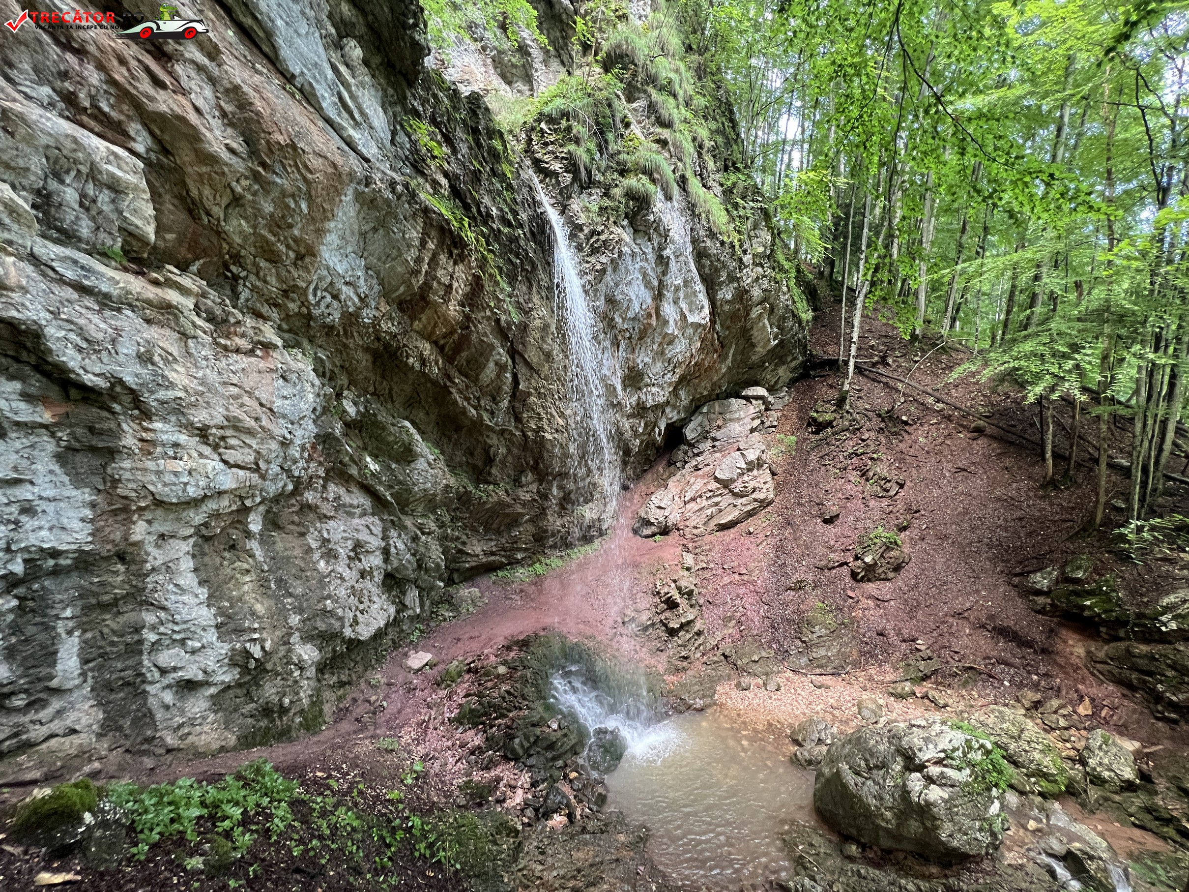 Traseul coboară pe acest vâlcel aprox. 30m diferenţă de nivel, până la baza unui perete înalt de 20m, situat pe partea stângă, dincolo de care se află cascada.
