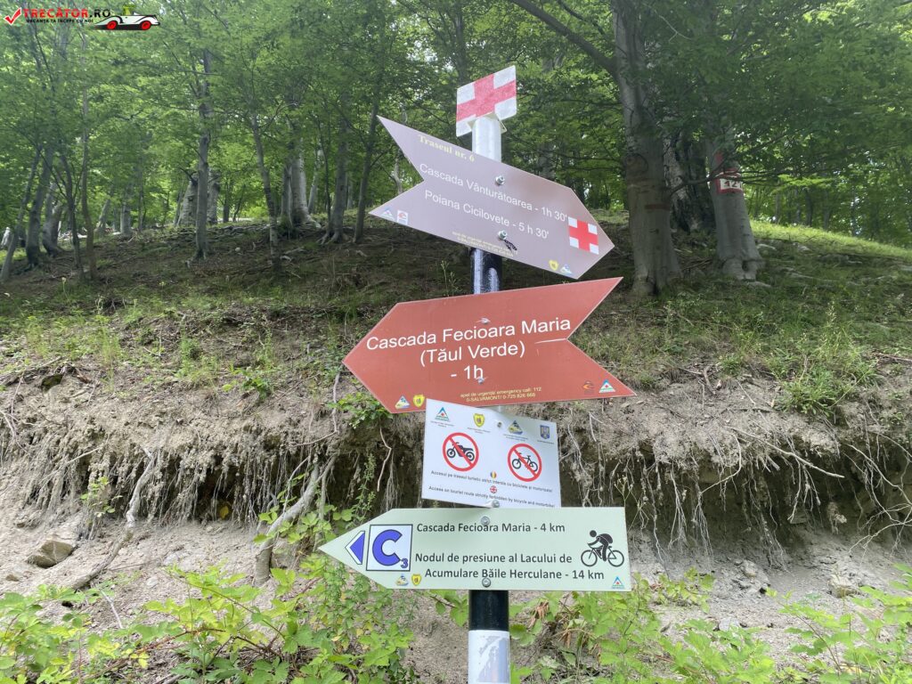 Traseul spre cascada Fecioara Maria pornește de la Podul Vânturătorii ce se afla la 12 km de stațiunea Băile Herculane, exact din locul unde se pornește și pe traseul marcat cu CR spre cascada Vânturătoarea – Poiana Cicilovete.
