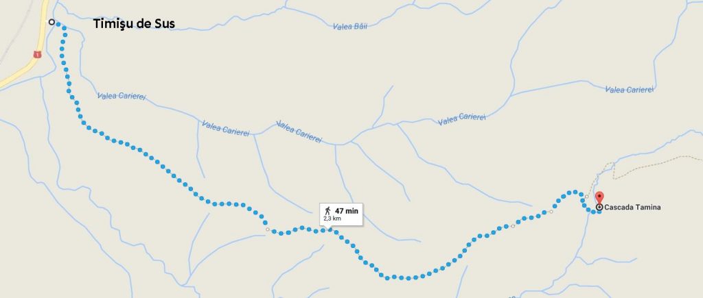 La fel se ajunge si cu trenul regio pana in localitatea Timisu de Sus, iar din gara se urmareste traseul cu banda albastra pe marginea soselei pana la indicatorul catre casacada Tamina. Intrarea în canion se face din partea dreaptă, în formă de circuit. Dacă doriți să coborăți pe scări puteți face stânga dar nu este recomandat. ( vezi poza de mai jos)