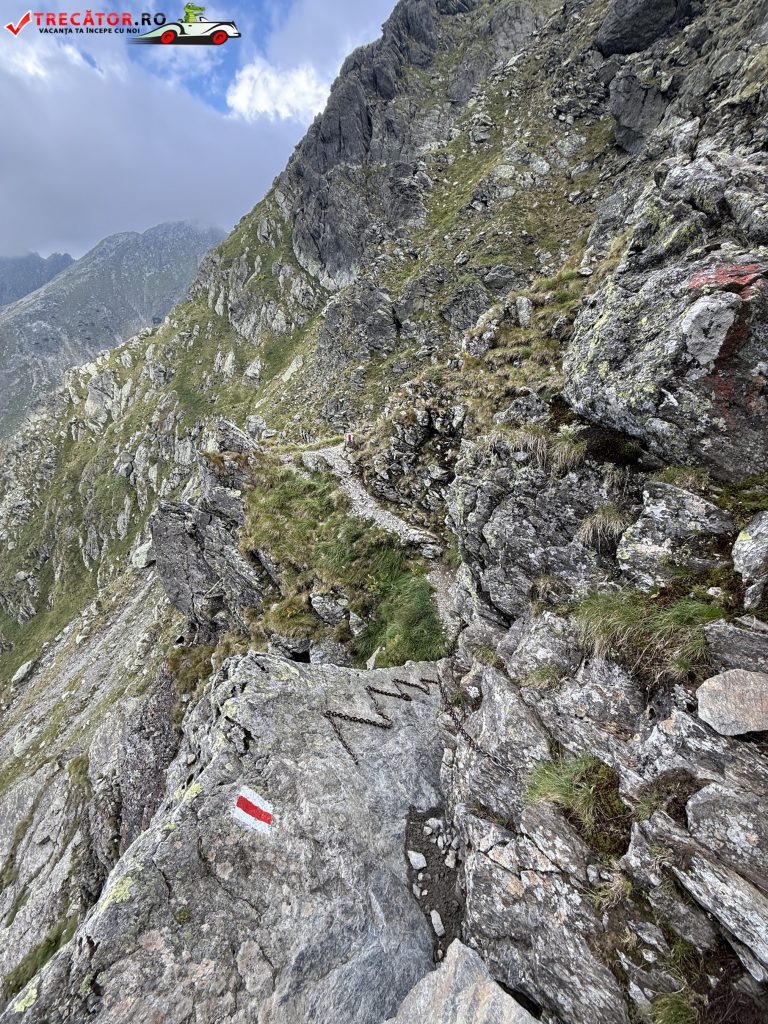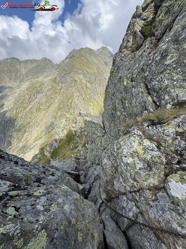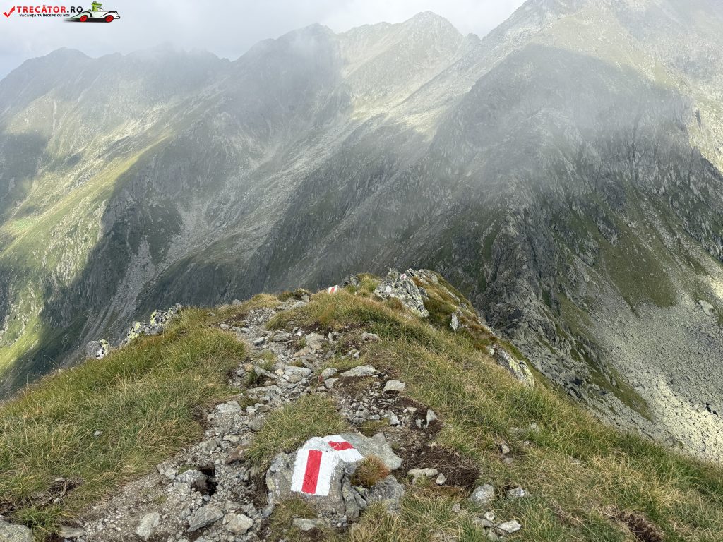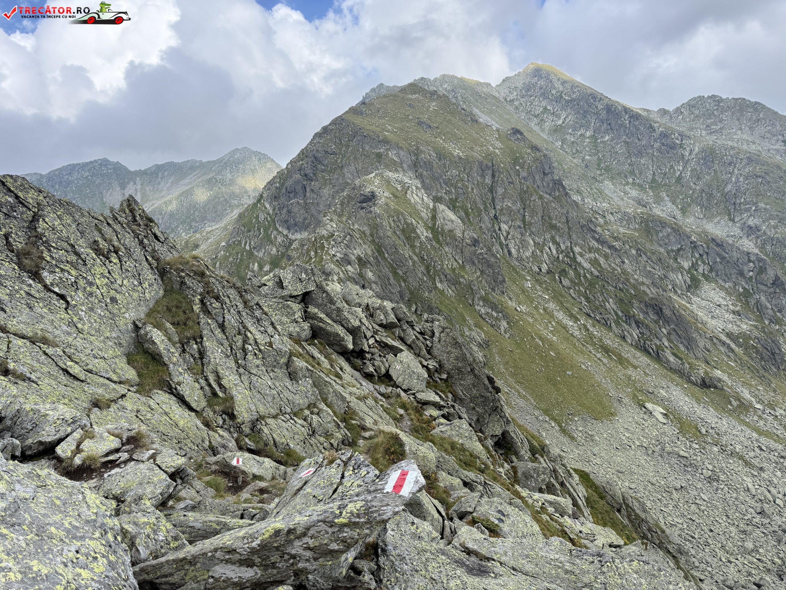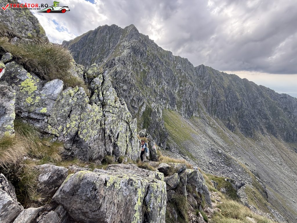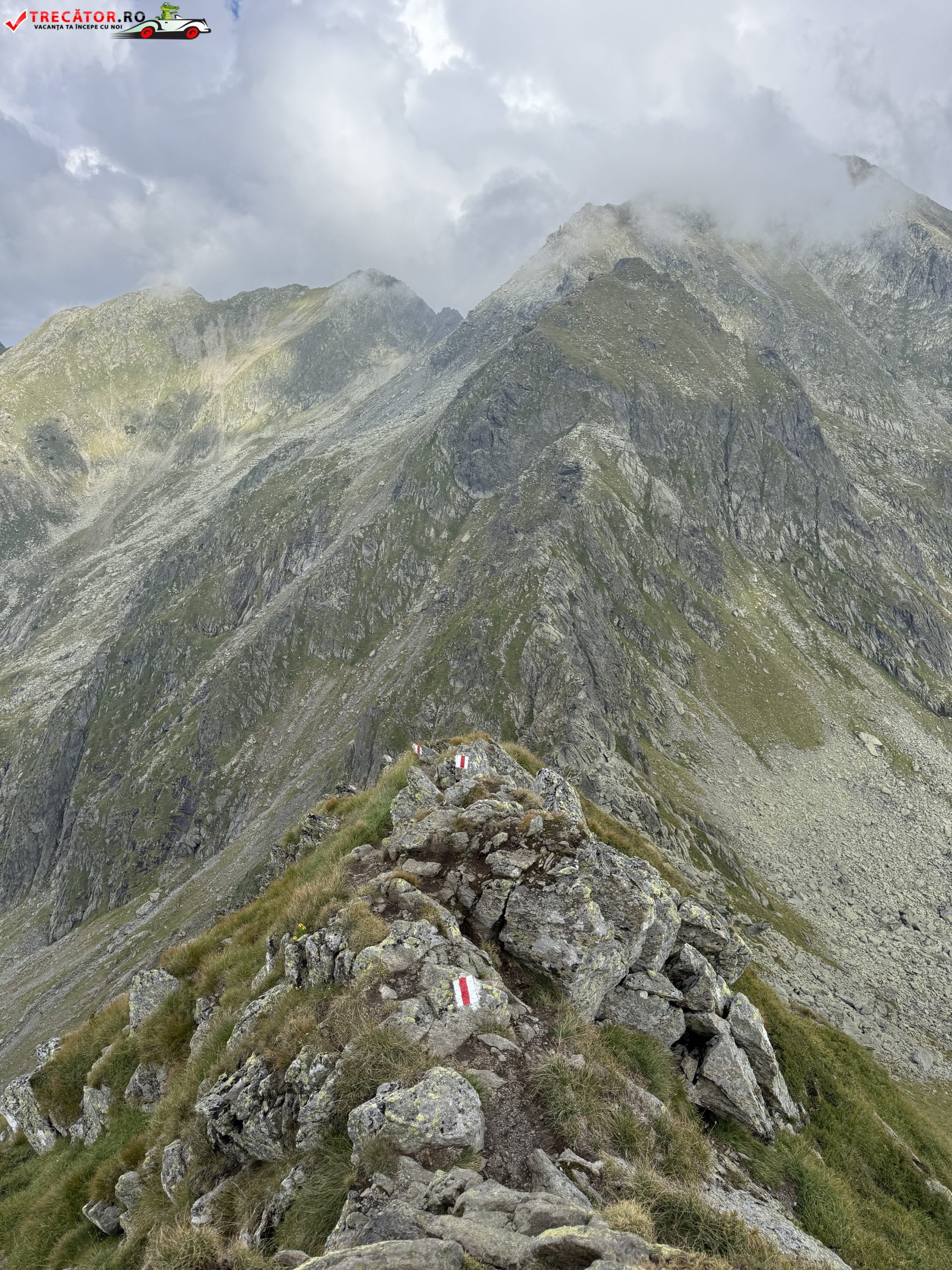 După ce traversezi Custura, traseul de întoarcere ales de noi nu continuă spre Vârful Negoiu, ci coboară spre Piatra Prânzului. Acest segment oferă o binevenită relaxare după tensiunea custurii.