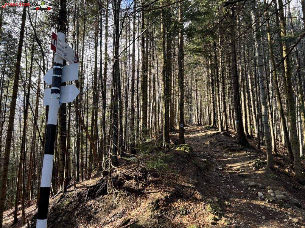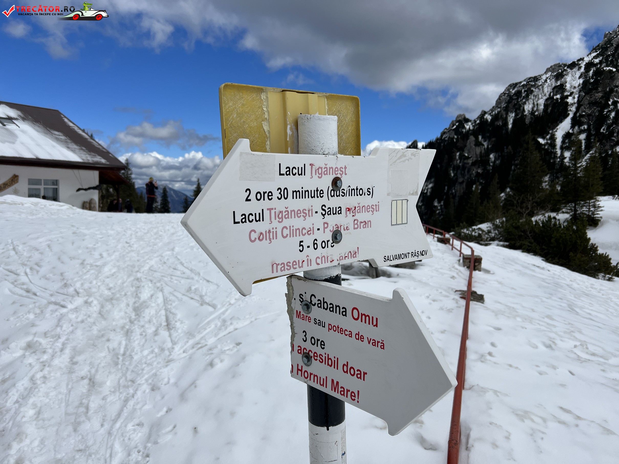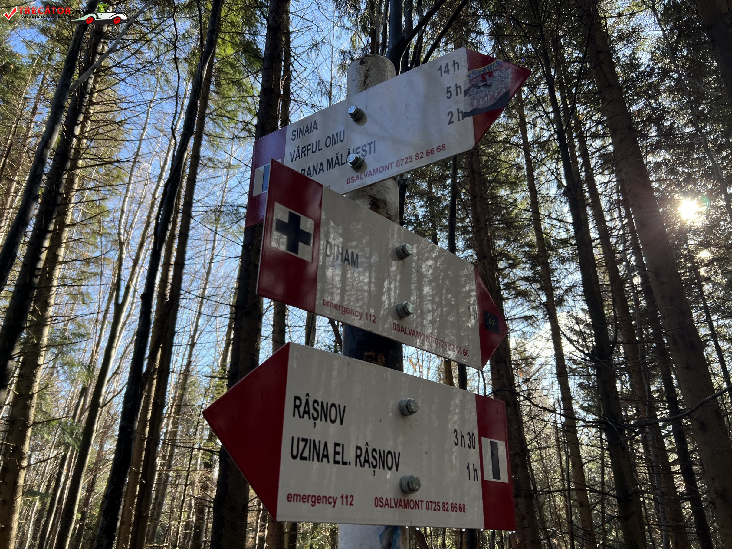 Aici găsim un panou câtre Cabana Mălăiești care ne spune că mai avem de mers circa 2 ore și 45 de minute, iar marcajul pe care trebuie să-l urmărim este bandă albastră. Poteca este foarte bine semnalizată și foarte vizibilă, astfel că nu există riscul să vă rătăciți.