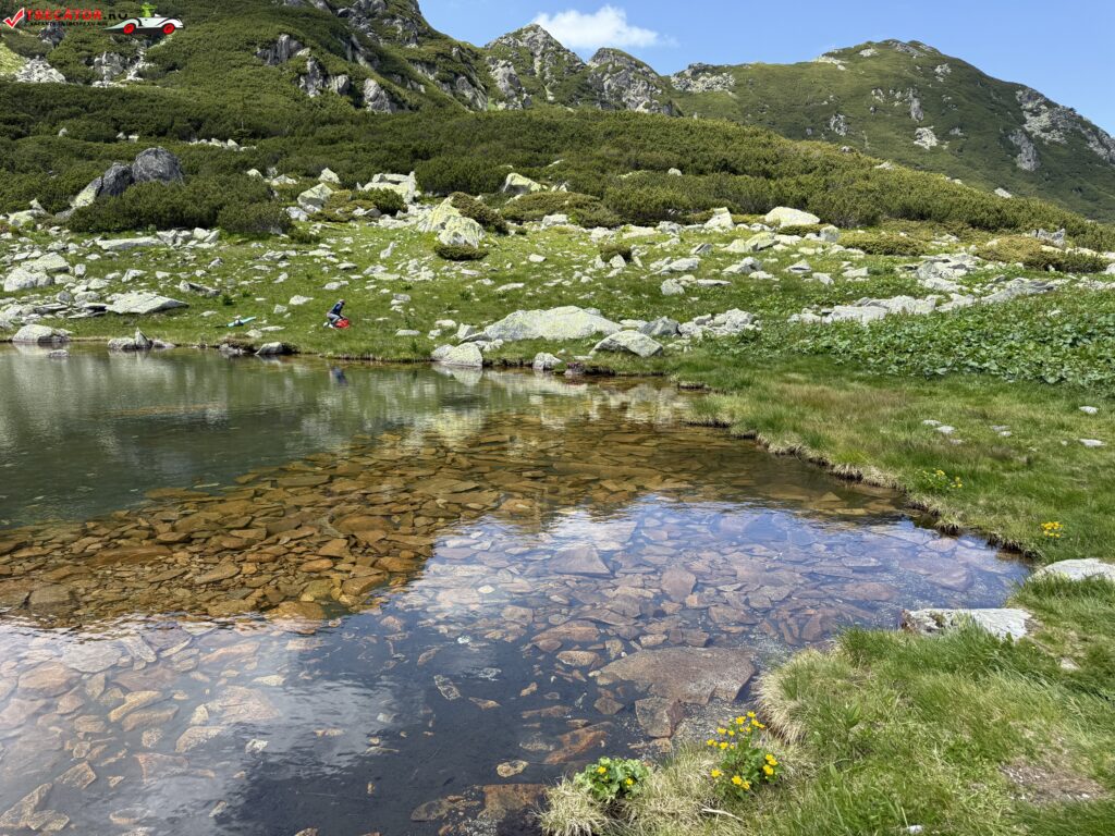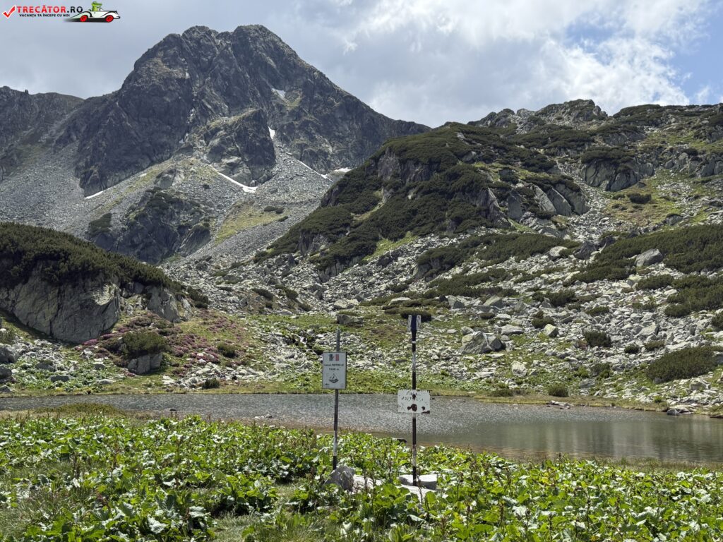 Pe mal există un mic platou care invită la odihnă – moment ideal pentru o gustare, câteva fotografii și bineînțeles, contemplarea liniștii din jur, cu privirea către crestele înalte care-l încadrează.