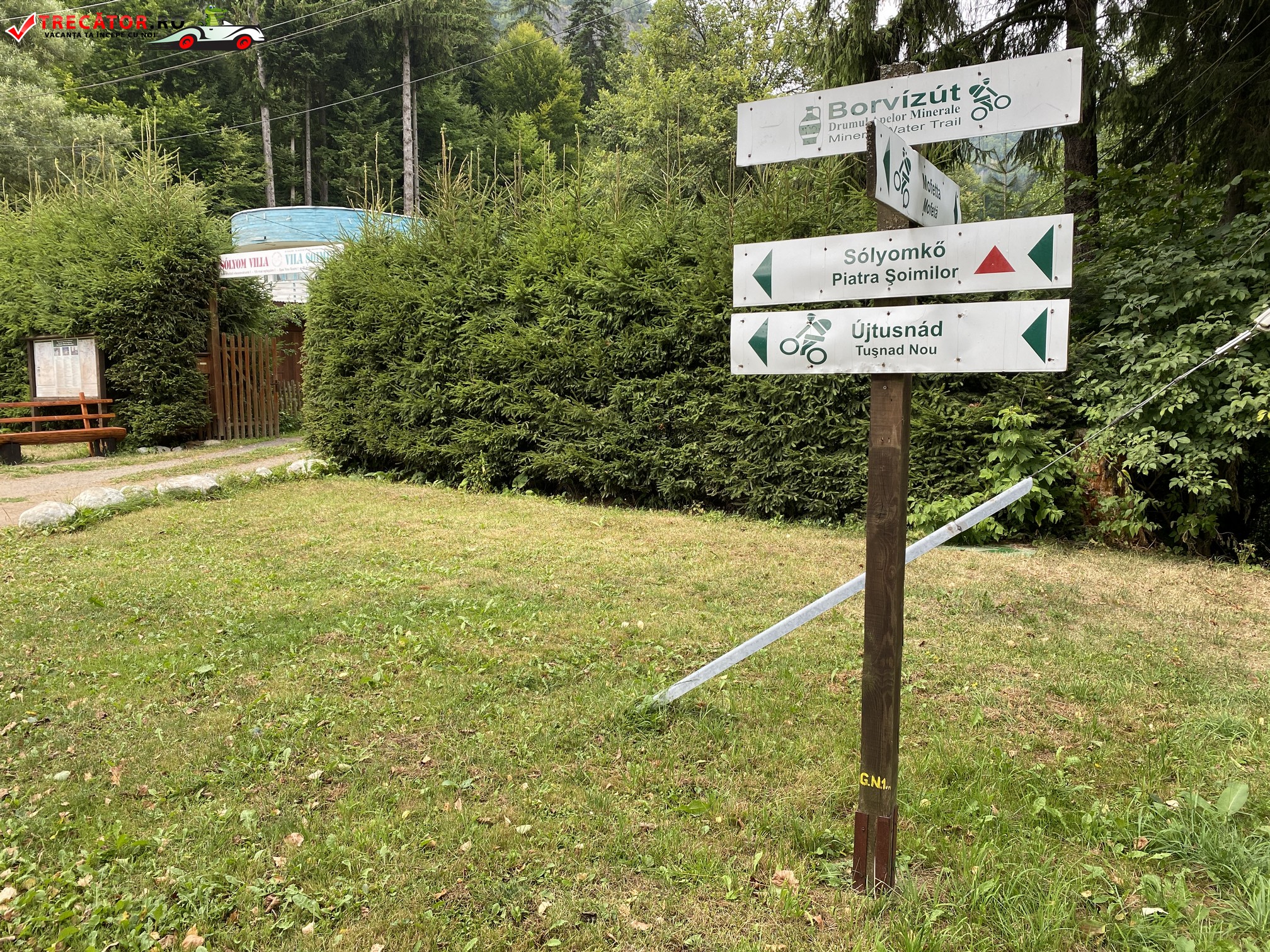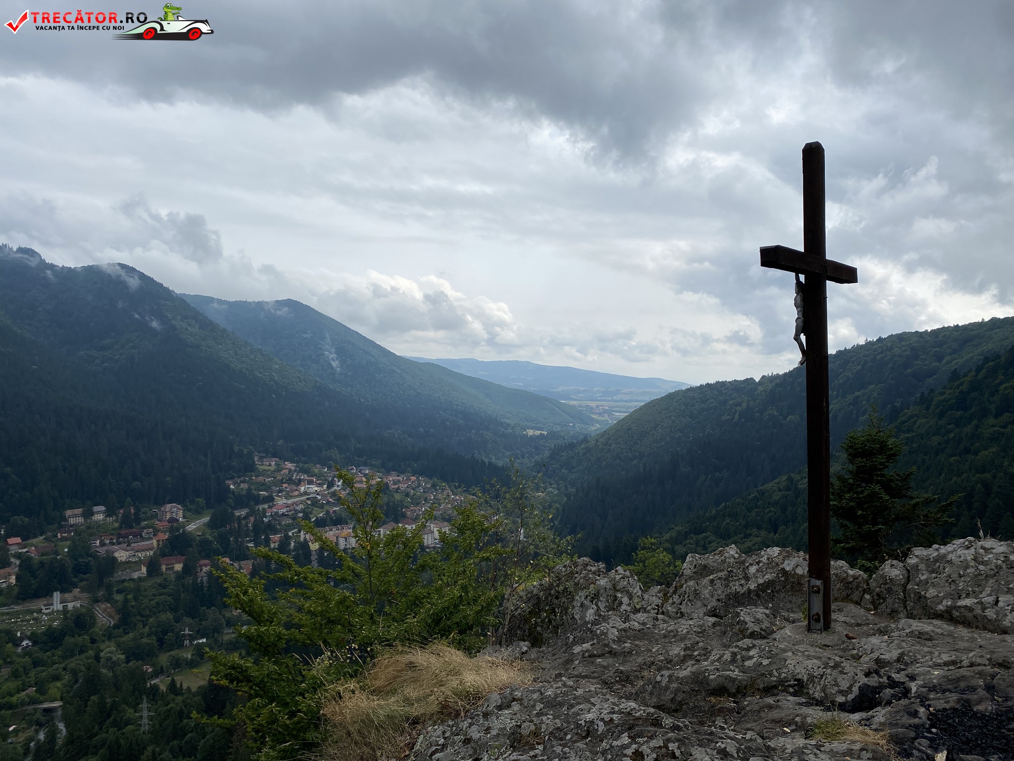 Puţin mai spre dreapta se abandonează poteca şi după aproximativ 10 m se urcă cu grijă pe o pantă abruptă şi se ajunge la un mic punct de belvedere. De aici se continuă 5 minute spre nord până când se ajunge la puctul principal de belvedere, unde se află și crucea de lemnn și de unde se poate admira panorama oraşului Băile Tuşnad, care în anul 1968 a fost declarat oraş, astfel devenind singurul oraş din bazinul Ciucului de Jos şi totodată cel mai mic din ţară.