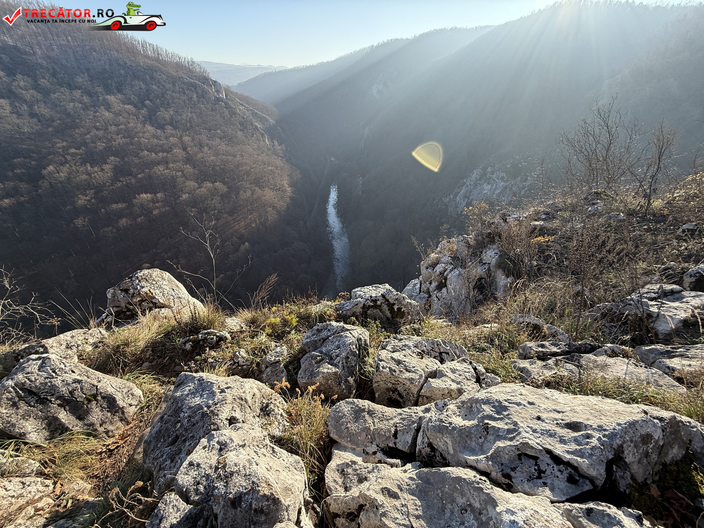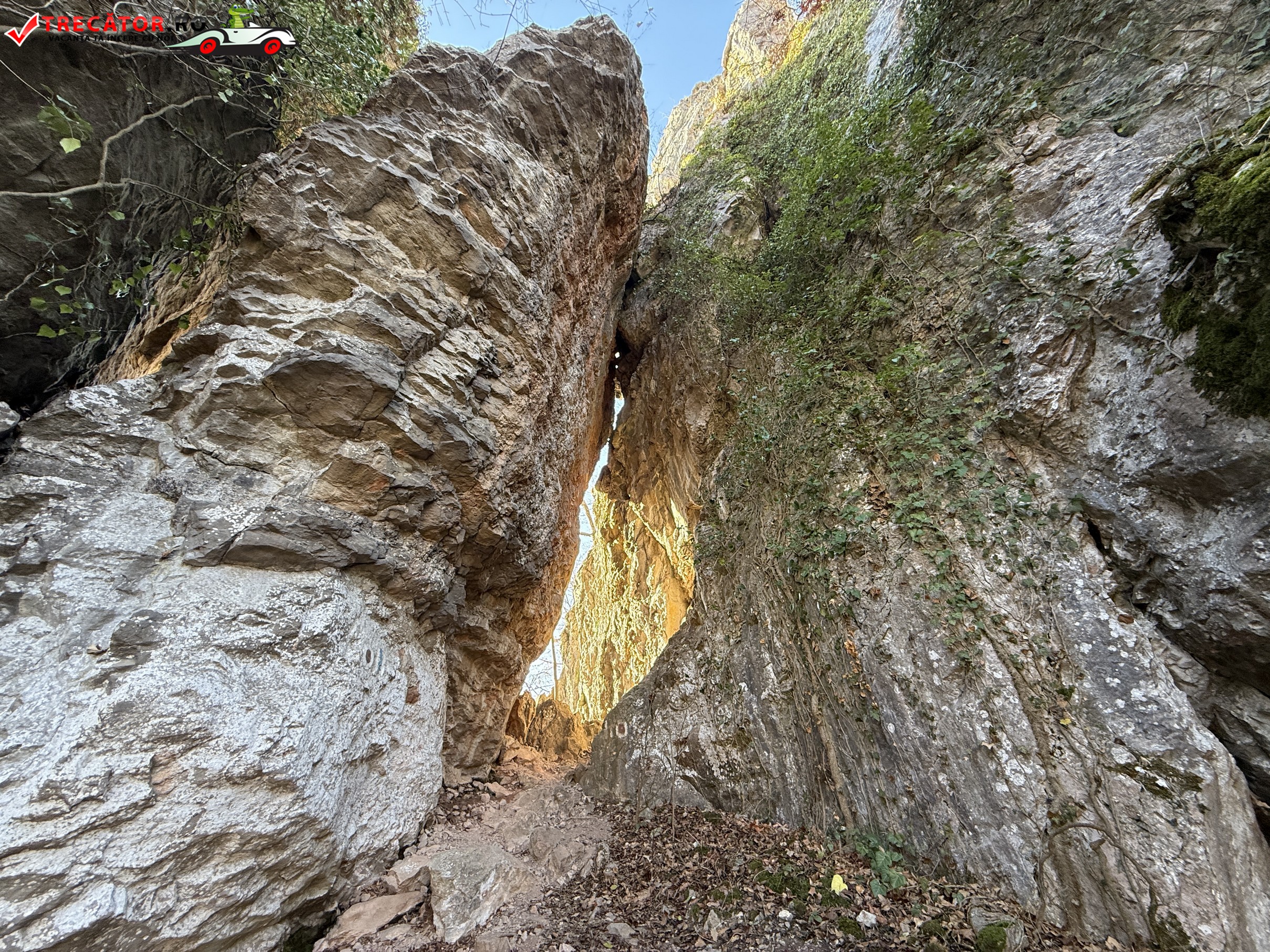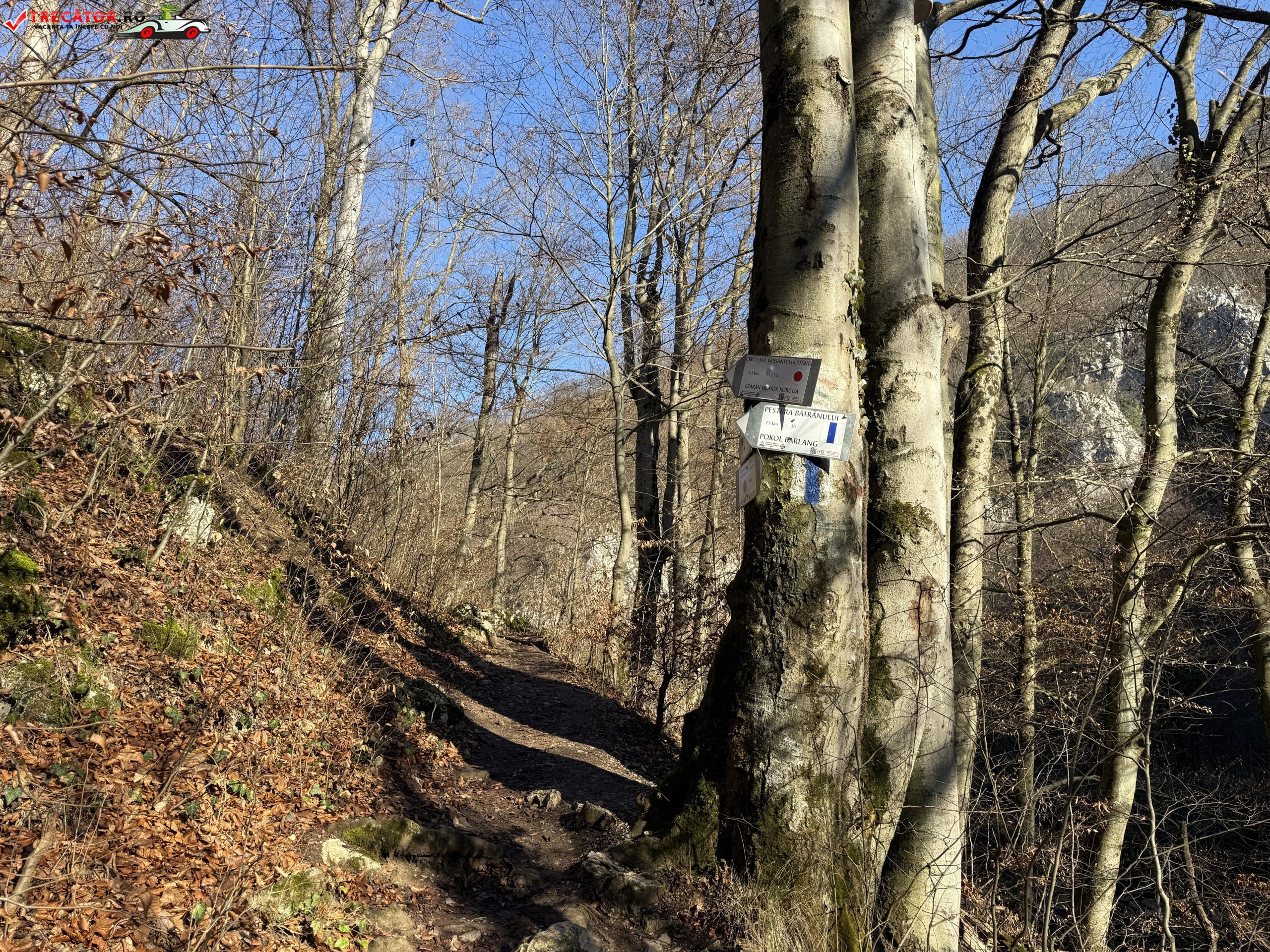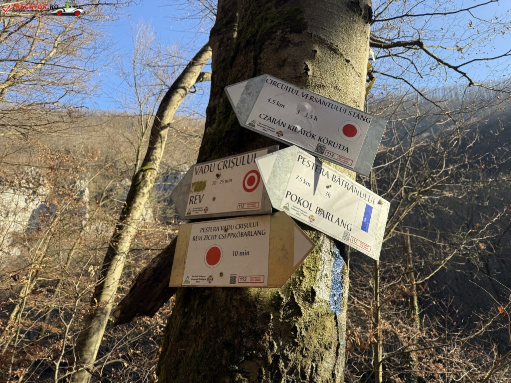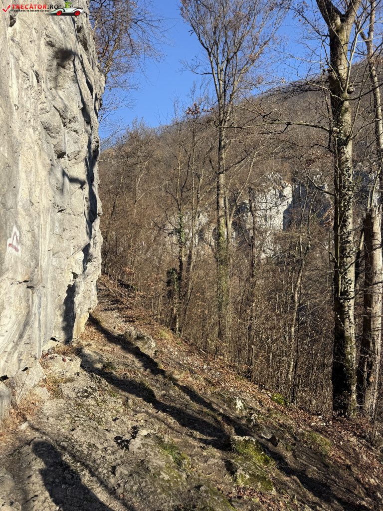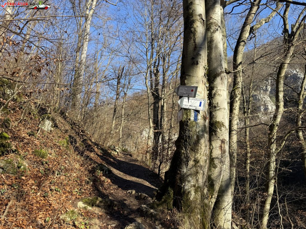 De aici poteca marcată cu bandă albastră urmează cursul unui traseu spectaculos ce combină elemente carstice, abrupturi stâncoase și puncte panoramice, traversând zone împădurite și deschideri spre largul văii râului și faimosul defileu.