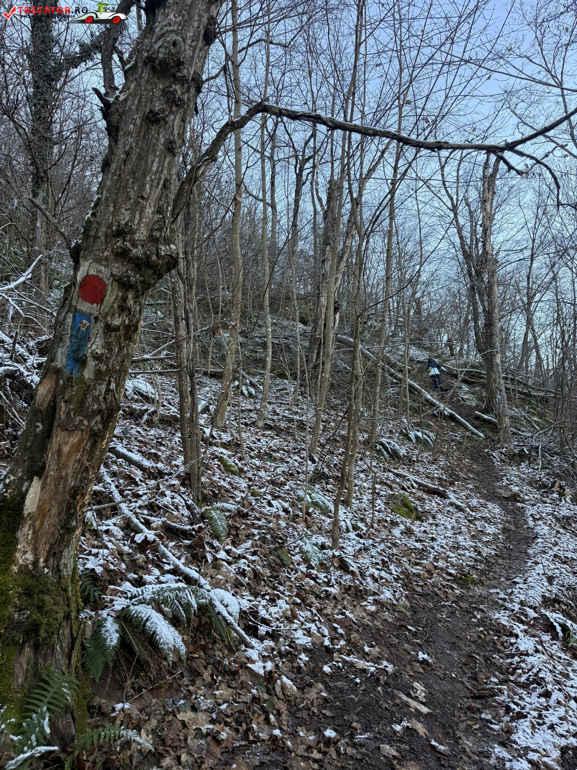 După bifurcarea și explorarea peșterilor Deventului, traseul urcă mai sus prin pădurea de pe versantul stâng, alternând porțiuni de urcuș moderat cu serpentine pe lângă formări carstice, doline și mici deschideri spre defileu. În această parte a drumului, marcajul albastru te conduce spre un punct de belvedere natural numit „La Terase”, de unde se deschid panorame superbe asupra Defileului Crișului Repede și a pădurilor din Munții Pădurea Craiului.