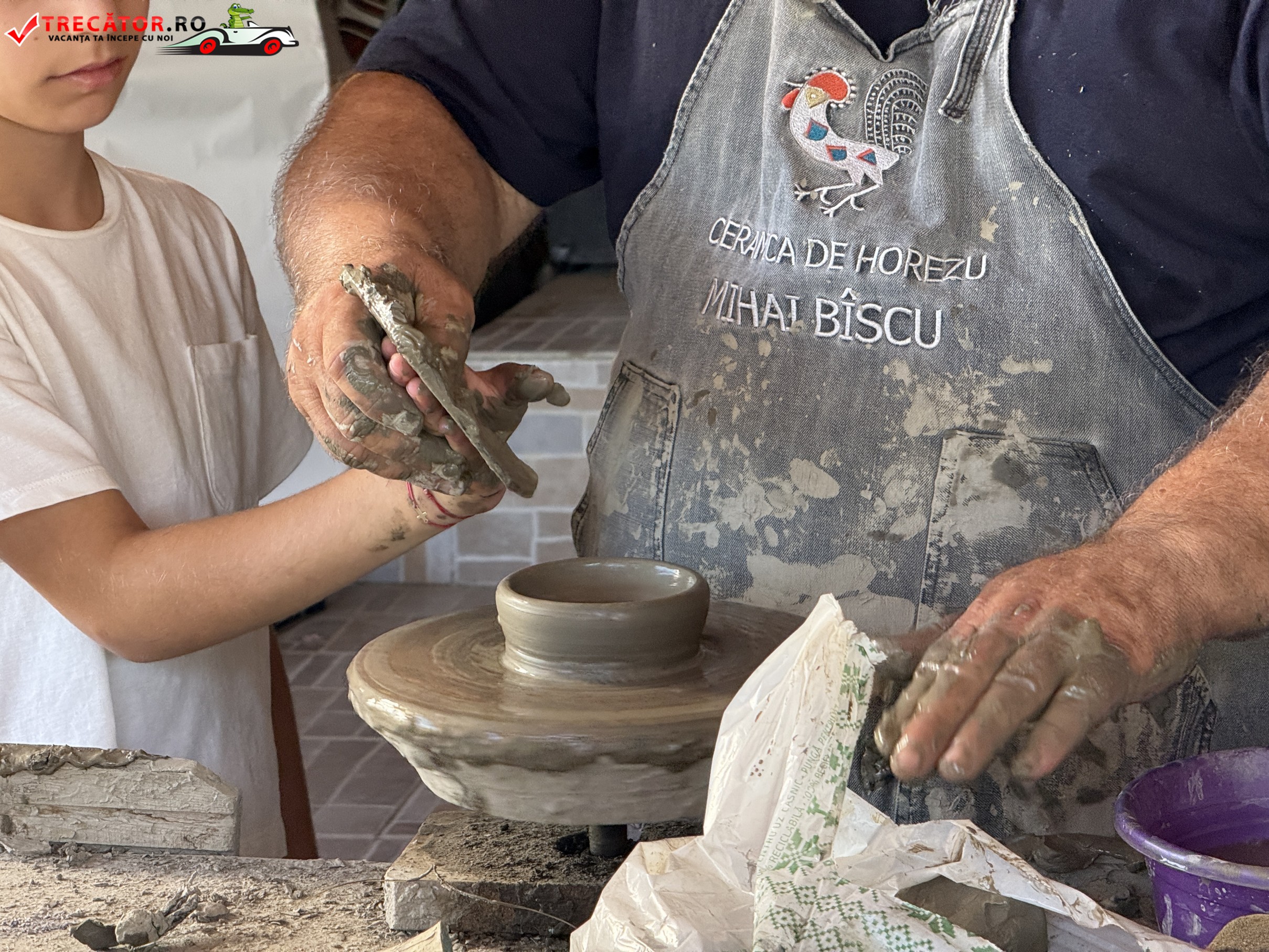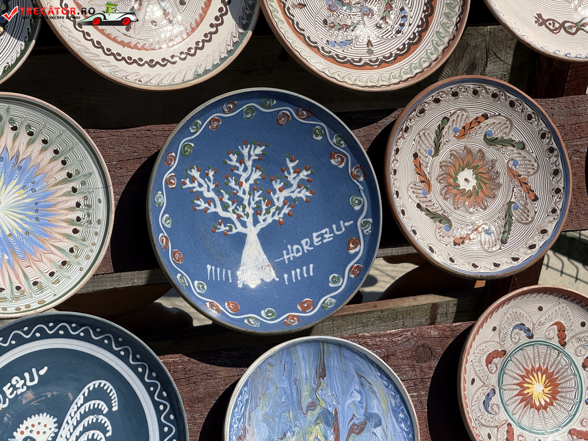 Ceramica de Horezu este distinctă, atât prin stil, cât și prin metodele de prelucrare: lutul este lucrat manual, pe roată, apoi decorat cu corn de bou și pană de gâscă, iar vopselele sunt naturale. Motivele florale, zoomorfe și cosmice – cocoșul (simbol esențial), spirala, pomul vieții, pești, flori, boboci, spice – creează un univers vegetal și mitologic fără pereche.