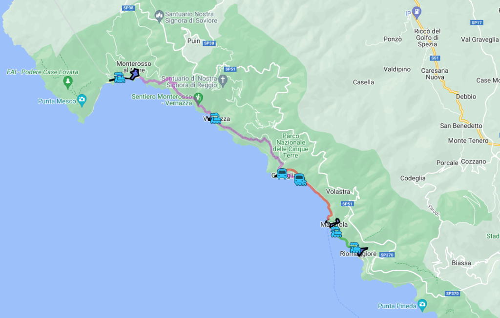 Poteca albastra, adica sentiero azzuro leaga cele cinci orasele printr-un traseu usor de parcurs de catre oricine si puteti sa va bucurati si de o panorama splendida. Traseul dureaza in jur de 5 ore fiind vorba de 12 km.